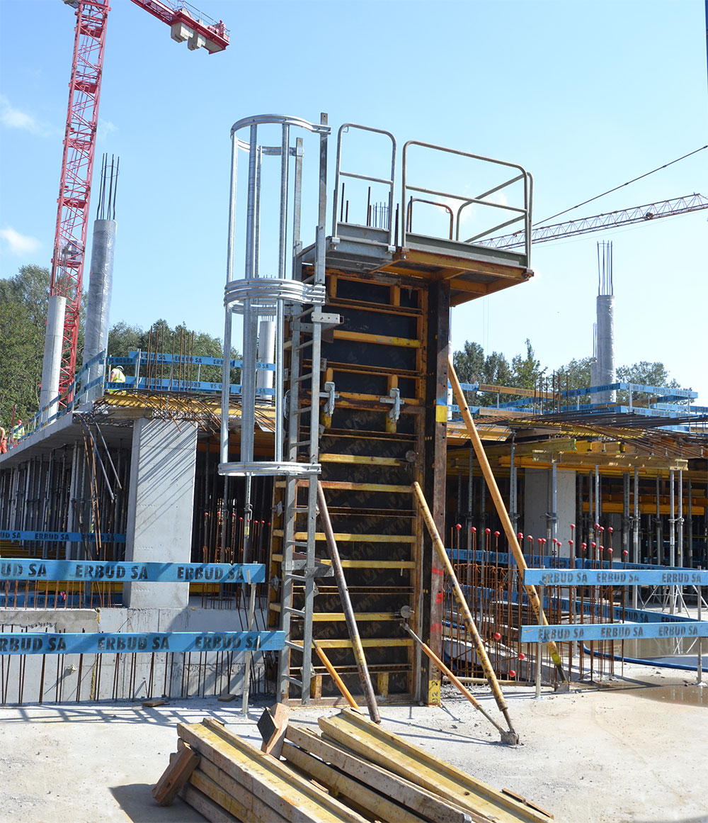 - Zapewnienie pełnego bezpieczeństwa poprzez montaż podestów na każdym deskowaniu słupowym.