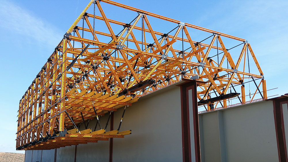 - Konstrukcja wsparta jest na szynach prowadzących, które umożliwiają przetaczanie wózka wzdłuż obiektu.