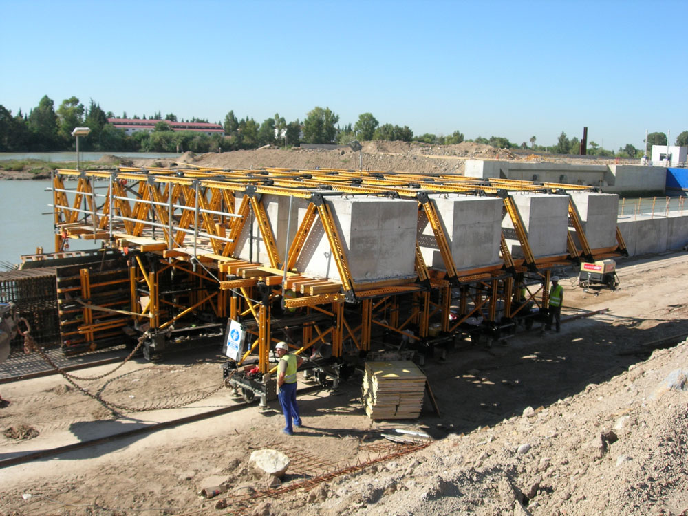 - Konstrukcja przesuwna: element drugorzędny, po którym odbywa się przemieszczanie. Przenosi obciążenia od sił powstających podczas przesuwania konstrukcji.