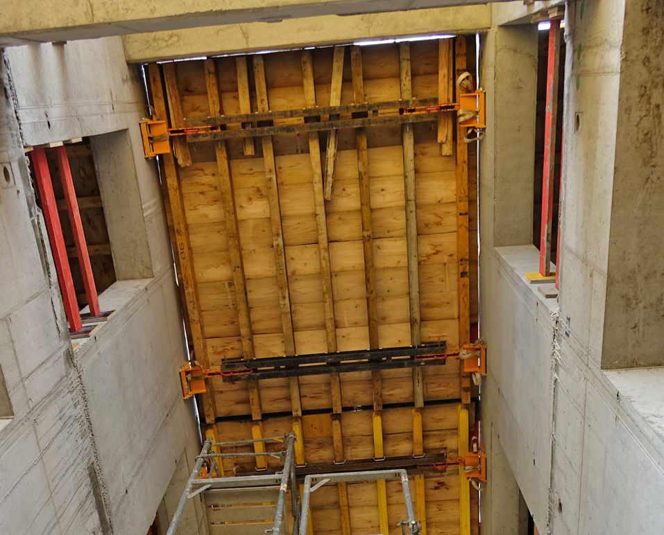 - Budowa systemu oparta na ryglach MK oraz belkach drewnianych VM, co pozwala na dopasowanie szerokości podestu do realizowanego szachtu.
