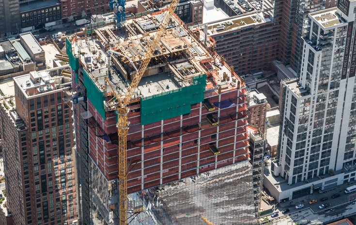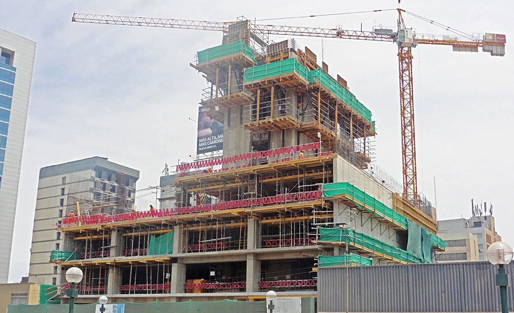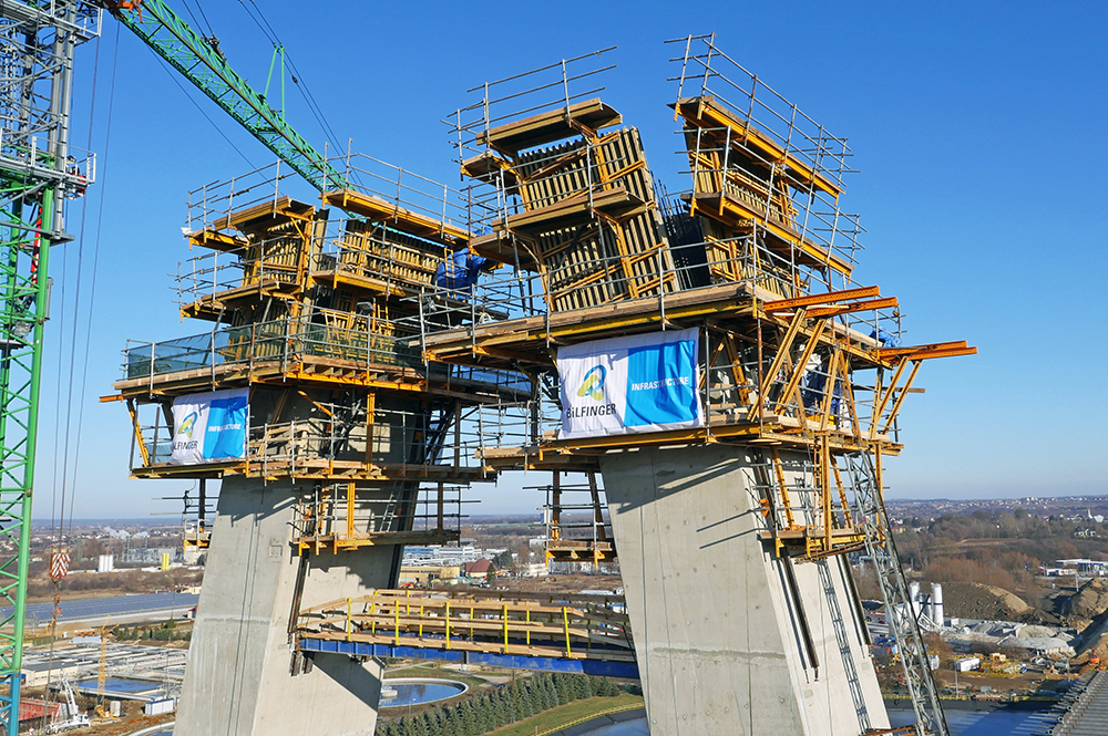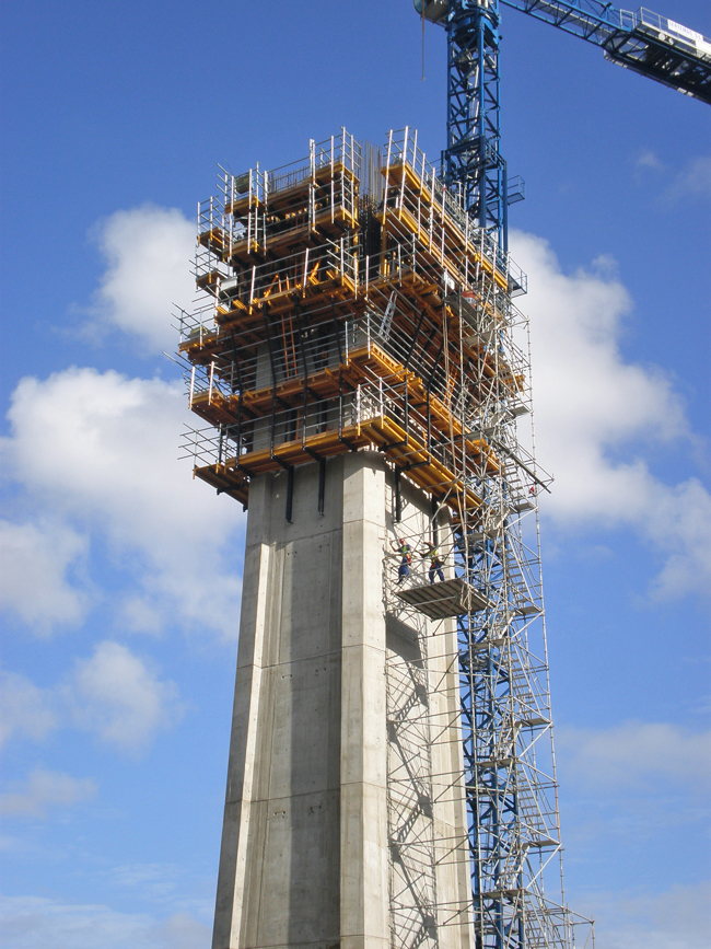 Wznoszenie konstrukcji umożliwia naprzemienny przesuw masztu i wsporników wraz ze zintegrowanym deskowaniem.