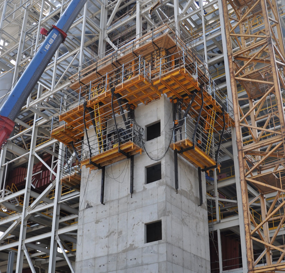 - Uniezależnienie obsługi deskowań od żurawia. Rozwiązanie pozwala na jednoczesne podnoszenie deskowania, podestów roboczych i pompy do betonu.