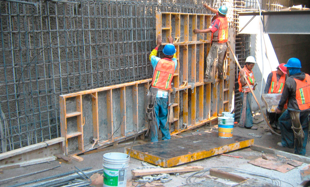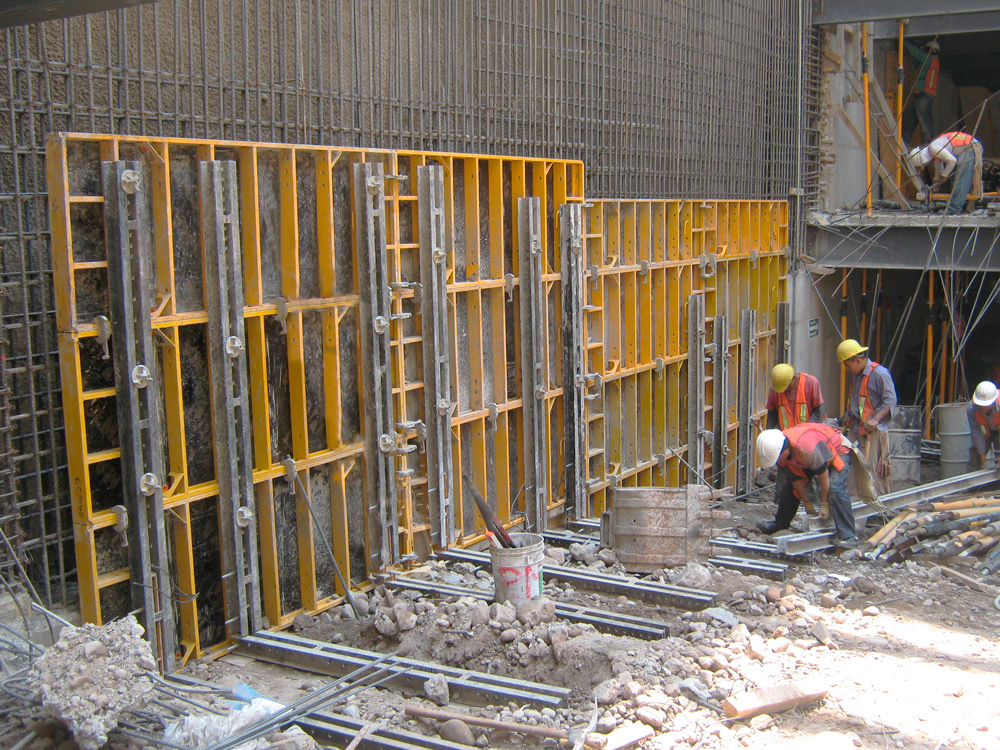 - Ściany na kondygnacjach podziemnych wypierane jednostronnie o wysokości 2,4 m i długości 14 m. Płyty deskowania NEVI o wymiarach 2,4 × 0,9 m oraz 2,4 × 0,6 m wyparto na konstrukcjach oporowych wykonanych z podpór pionujących E i dźwigarów DU-100 o długościach 2,5 i 3 m.