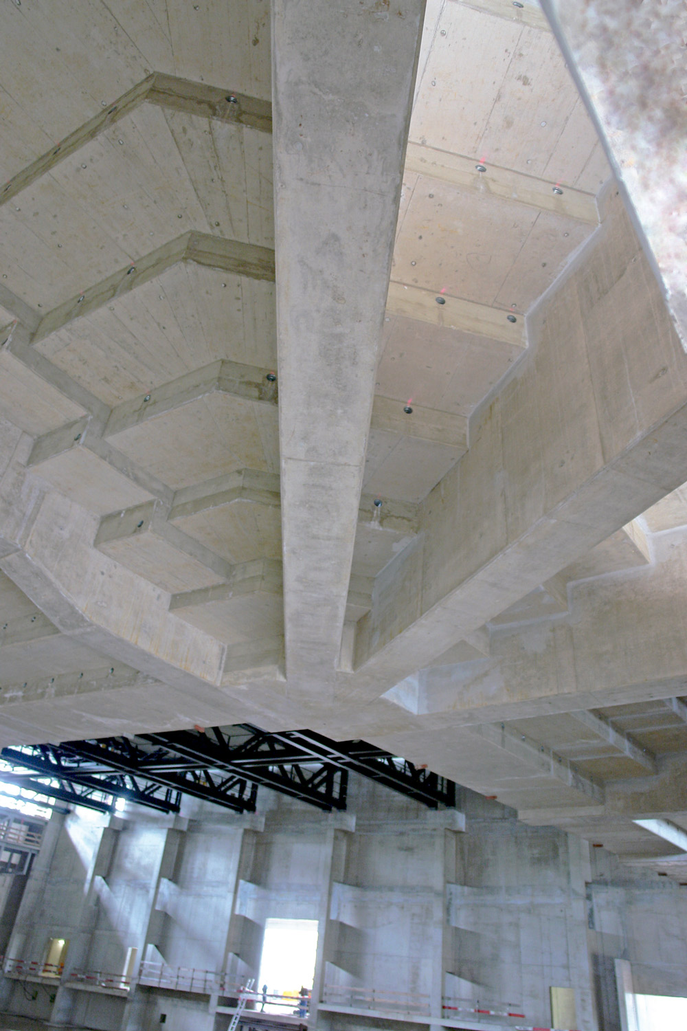 Możliwość łączenia płyt w pionie i w poziomie, jak również elementy uzupełniające i kompensacyjne systemu pozwoliły na elastyczne dostosowanie deskowania do geometrii obiektu. Na przyspieszenie prac wpłynęła także możliwość łączenia płyt w duże zespoły do przenoszenia za pomocą żurawia.