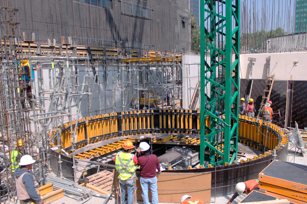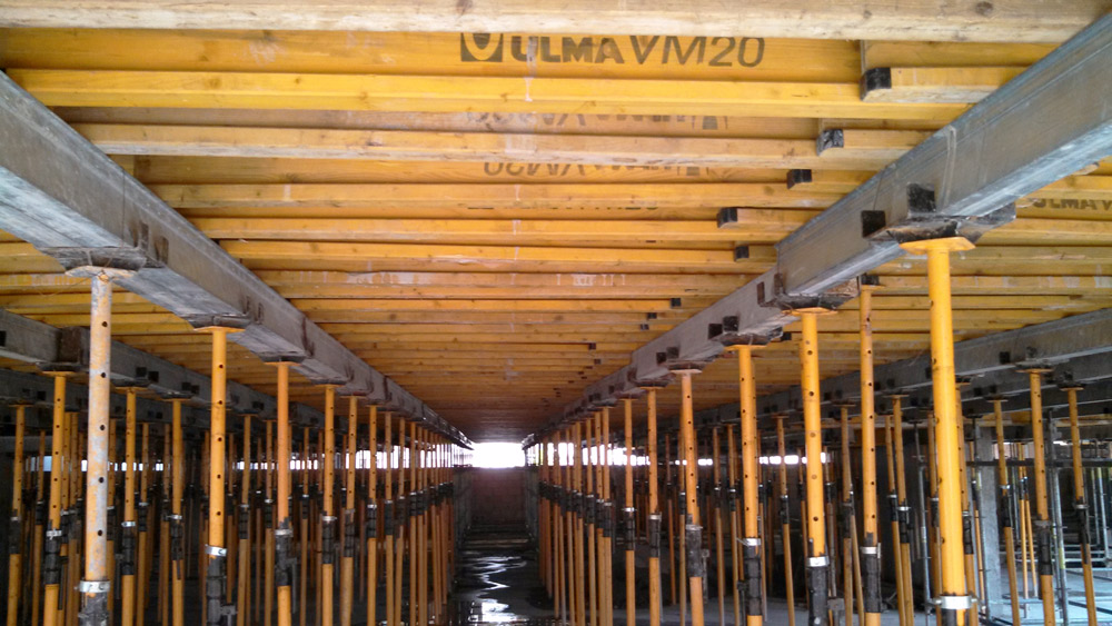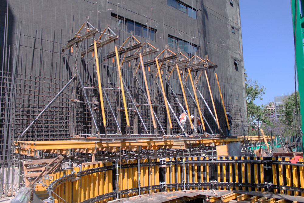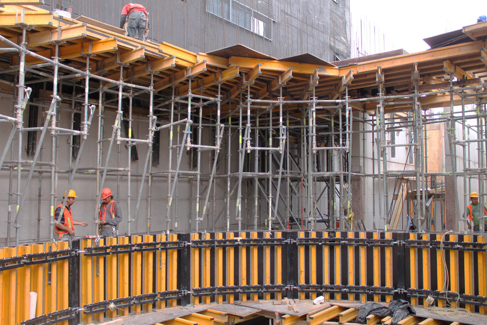 Stropy wykonano przy użyciu deskowania ENKOFLEX ustawionego, w zależności od wymaganej wysokości, na dwóch rodzajach wież. Deskowania stropowe o wysokości z zakresu od 6 do 8 m układano na wieżach BRIO, stropy na wysokościach do 3,60 m na wieżach G. Podczas realizacji okrągłych balkonów oraz belek szachtu centralnego wykorzystano konstrukcje wieżowe zaprojektowane na bazie rusztowania modułowego BRIO.