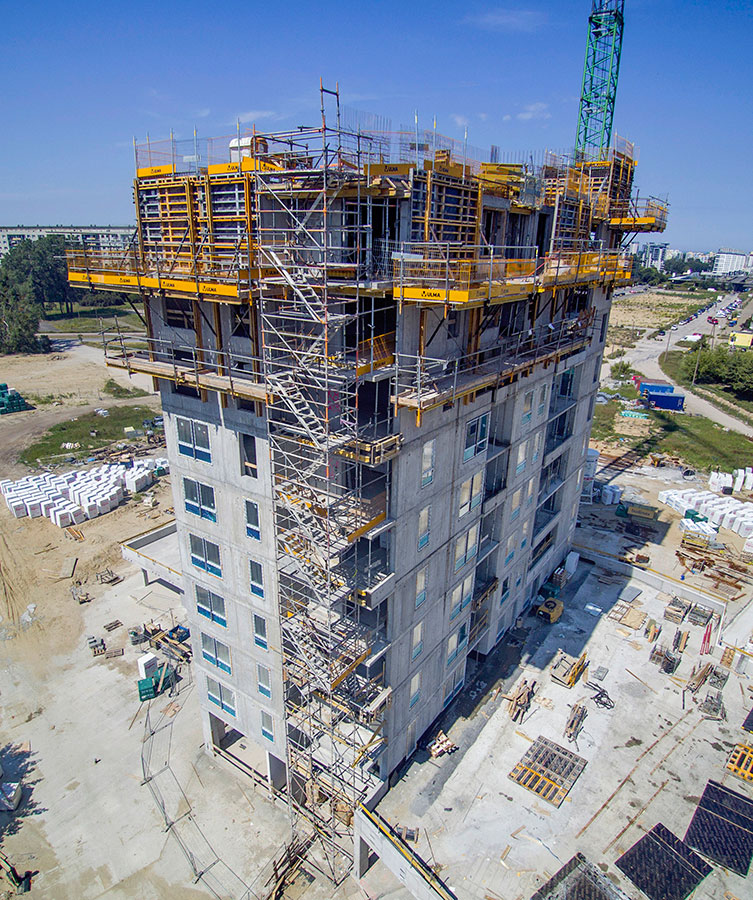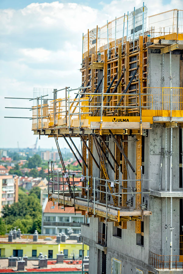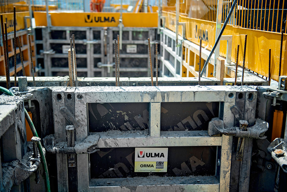 Do realizacji budynków wysokich ULMA zaproponowała system wznoszący RKS-L z wózkami BMK. Na budowę dostarczono 17 pomostów RKS, każdy został zaprojektowany indywidualnie z uwagi na zmienną geometrię poszczególnych kondygnacji. Wysokość deskowania wynosiła 3,3 m. Pomosty RKS złożone były z podestu głównego i podestu roboczego do odzyskiwania głowic. Na podeście głównym znajdowały się wózki BMK oraz deskowanie zewnętrzne ścian w systemie ORMA.