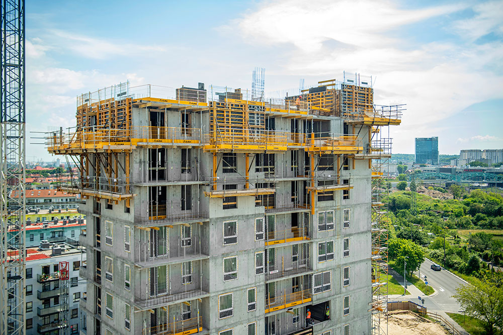 Kondygnacje podziemne zrealizowano z wykorzystaniem aluminiowego deskowania panelowego CC-4, stropy kondygnacji nadziemnych zaprojektowano zaś w technologii Filigran.