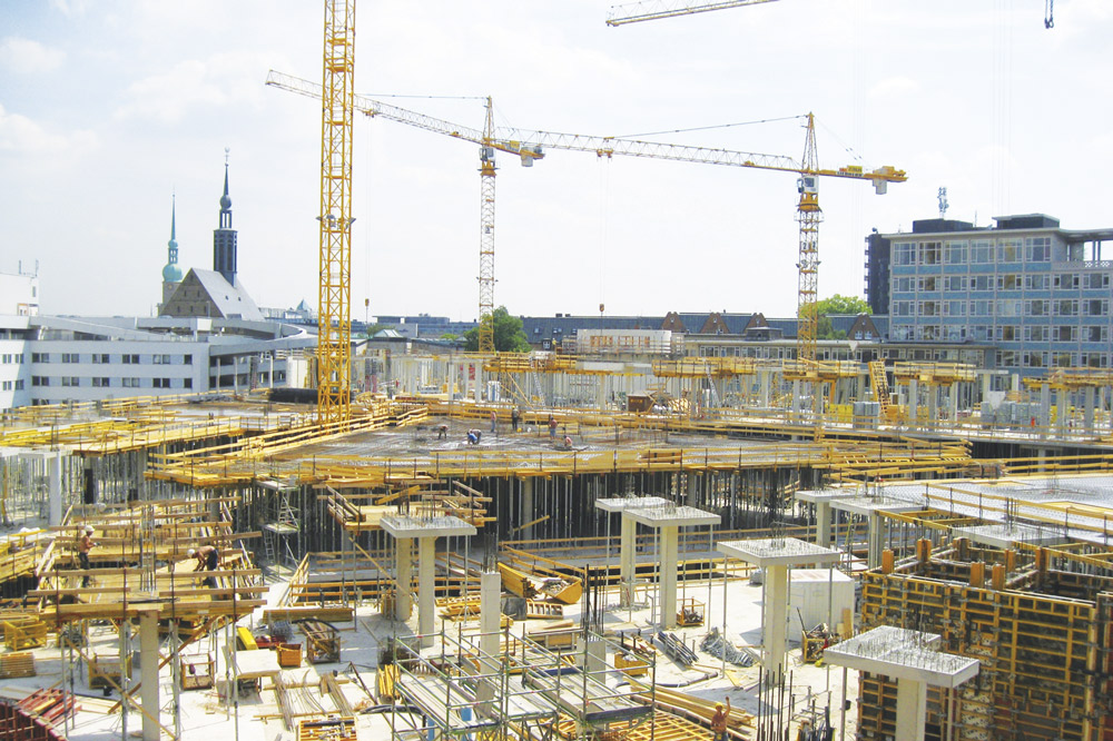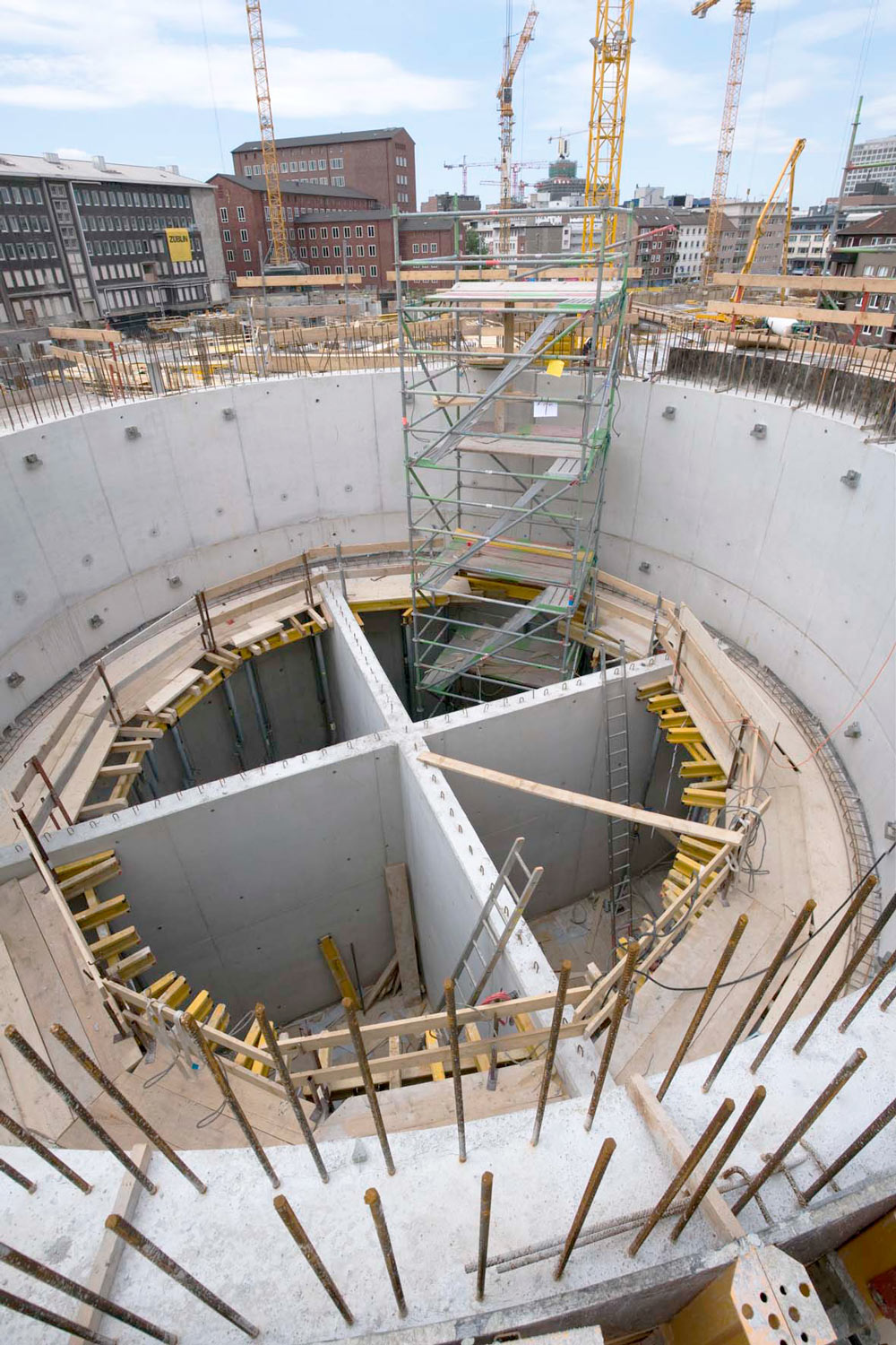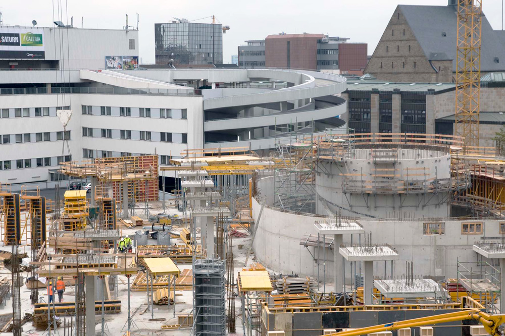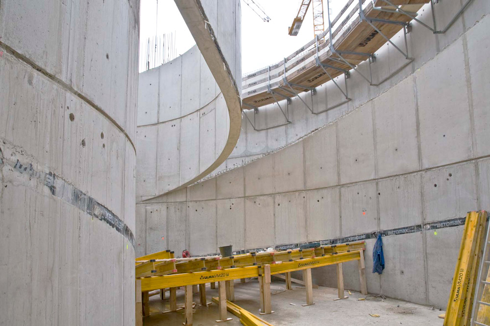 Szeroki zakres dostępnych płyt systemu ORMA pozwolił na dopasowanie deskowania do złożonych kształtów i wymiarów ścian nośnych oraz klatek schodowych. Formowanie naroży różnych od 90º realizowane było przy użyciu niewielkiej ilości akcesoriów dodatkowych, co wpłynęło na tempo prowadzonych prac.
