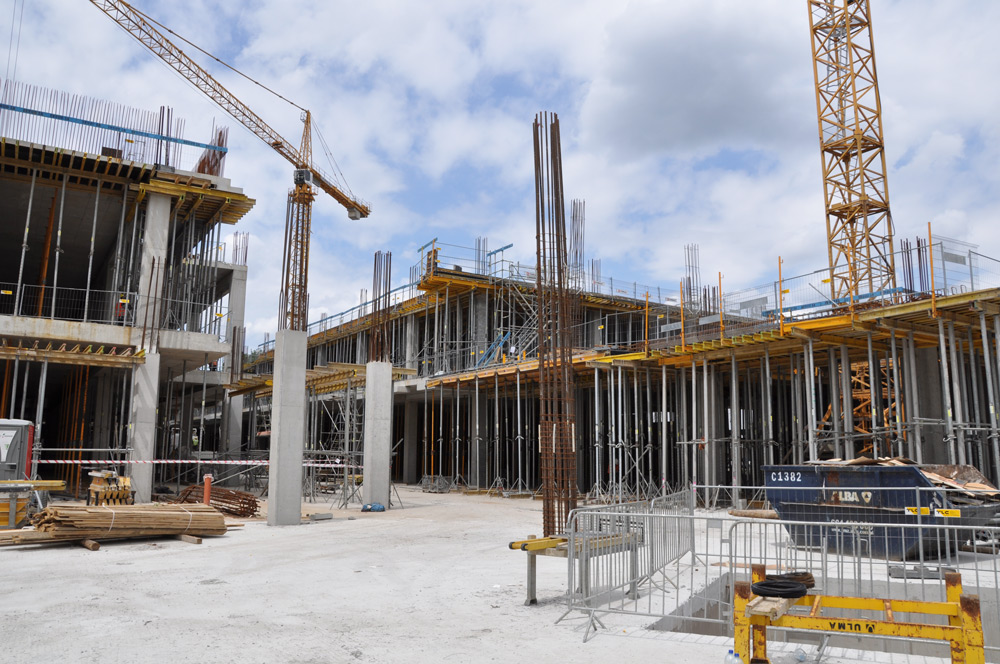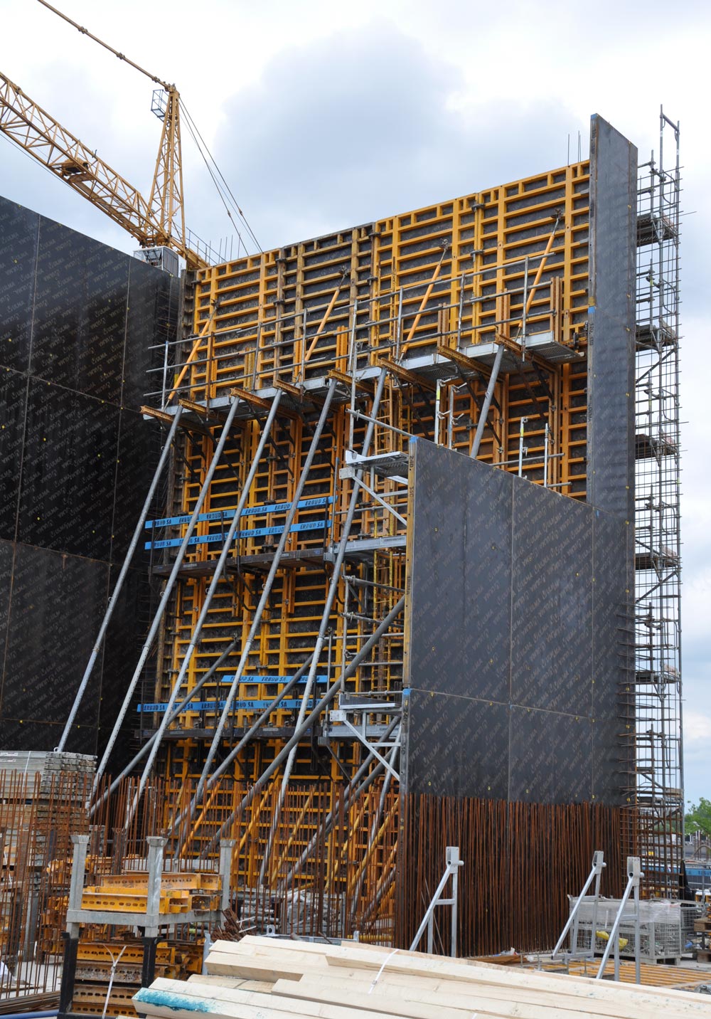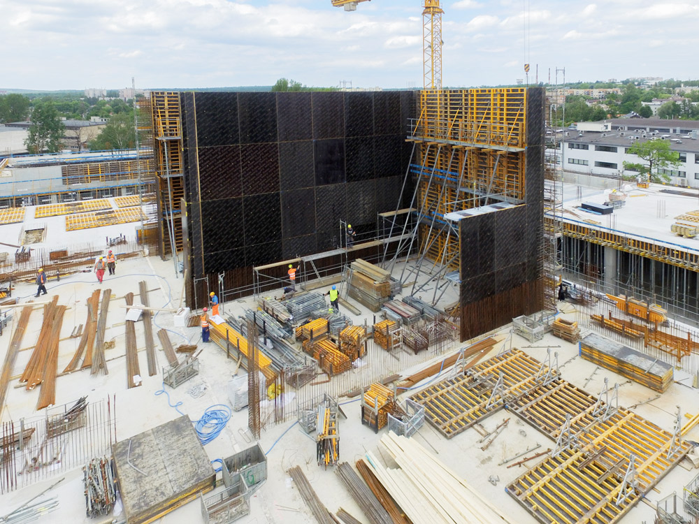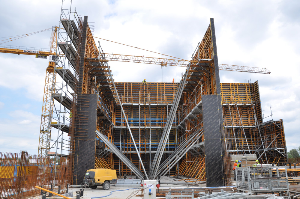 Galeria posiada dwie kondygnacje handlowe oraz trzecią, ostatnią przeznaczoną na kina oraz na lokale gastronomiczne. Stropy posiadają wysokość w świetle przekraczającą 5,00 m oraz zostały zaprojektowane jako konstrukcje płytowo-słupowe o grubości od 25 do 30 cm z lokalnie występującymi belkami usztywniającymi. Słupy o wymiarach od 60x60 cm do 80x80 cm realizowane są za pomocą deskowania ORMA. Deskowania słupowe zostały wyposażone w systemowe podesty F4 z pełną komunikacją pionową i dostępową. Sprawną realizację stropów zapewnia deskowanie panelowe CC-4, którego dostarczono na budowę prawie 6000 m2. Deskowanie stropowe ustawiono na podporach EP klasy C+D. Najwyższe, wykonywane na budowie ściany kin o wysokości prawie 13 m są również wykonywane za pomocą deskowania ORMA. Na budowie pracuje przeszło 3500 m2 deskowań ściennych.