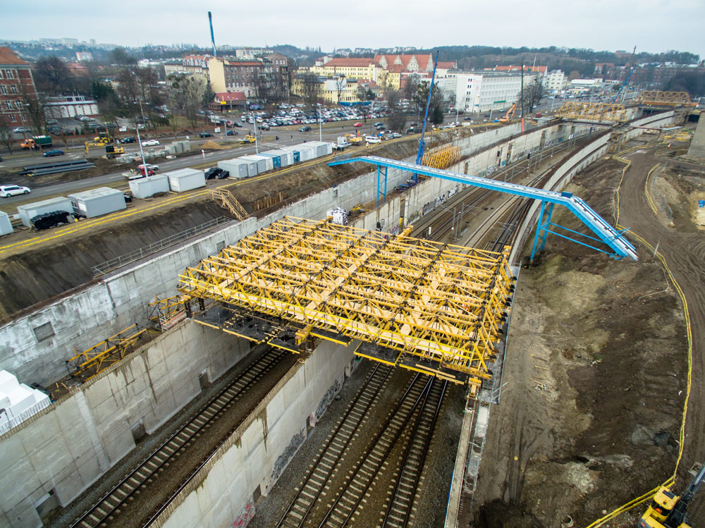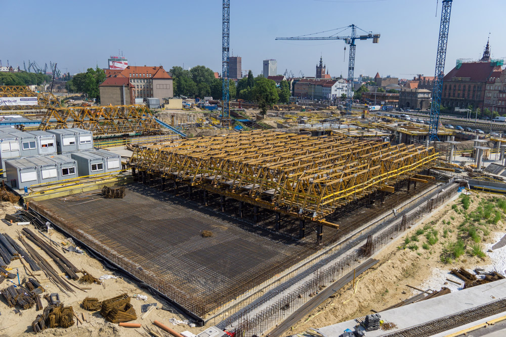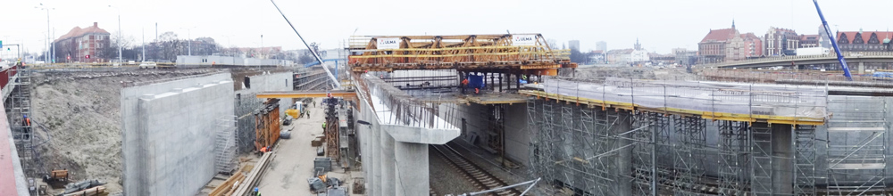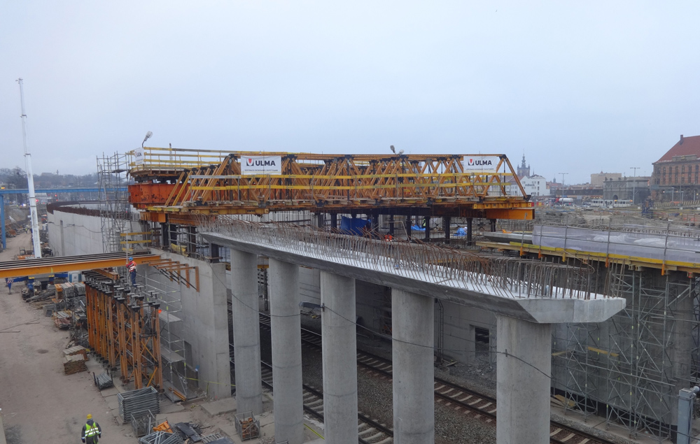 Realizację inwestycji rozpoczęto od budowy tunelu kolejowego o szerokości 26 m i długości około 400 m. Ściany boczne tunelu wzniesiono w deskowaniu ramowym ORMA, wyposażonym w systemowe pomosty robocze. Szczególne wyzwanie stanowiło wykonanie płyty żelbetowej przykrywającej torowisko linii PKP i SKM, ze względu na konieczność dostosowania rytmu budowy do ciągłego ruchu pociągów. Wszelkie prace montażowe odbywały się nocą, przy ruchu wstrzymanym na około 3 godziny. Na potrzeby realizacji płyty górnej tunelu ULMA dostarczyła 14 blachownic TAC 1200 o długości 12 m oraz kilka typów kratownic MK o długości w zakresie od 15 do 33 m i dwóch wysokościach: 3 oraz 6 m. Oprócz kratownic stacjonarnych na budowie pracowały również 30 - metrowe kratownice przejezdne o wysokości 6 m. Blaty deskowania płyty podwieszono do struktur kratownic i blachownic za pomocą ściągów DW oraz zaprojektowano w taki sposób, aby można było opuszczać deskowanie pomiędzy liniami trakcji. Ruszt blatów wykonano na bazie rygli MK i dźwigarów drewnianych VM20. Elementy prefabrykowane ustawiono na istniejących ścianach za pomocą stalowych stołków. Do obsługi stołków i kratownic zaprojektowano specjalne pomosty robocze BHP z wykorzystaniem rygli MK, dźwigarów drewnianych VM20, podpór typu E i systemowych słupków poręczy VR.
