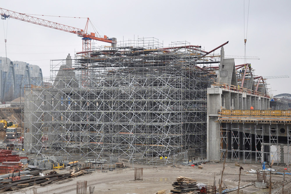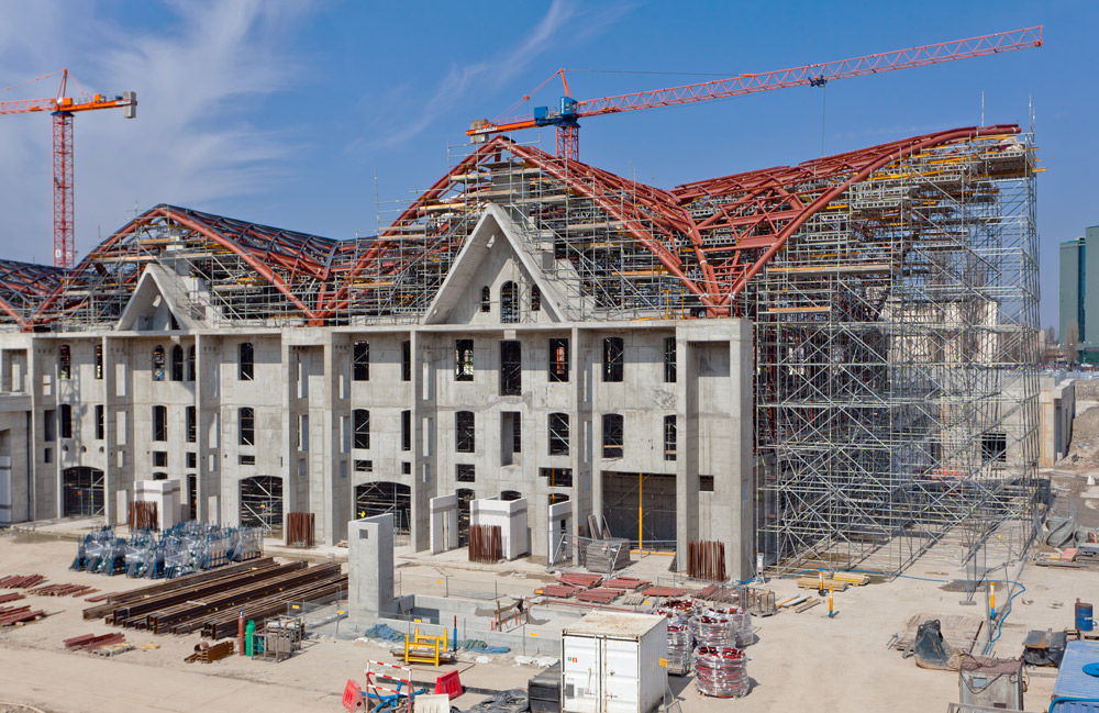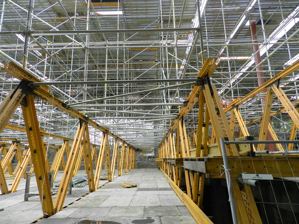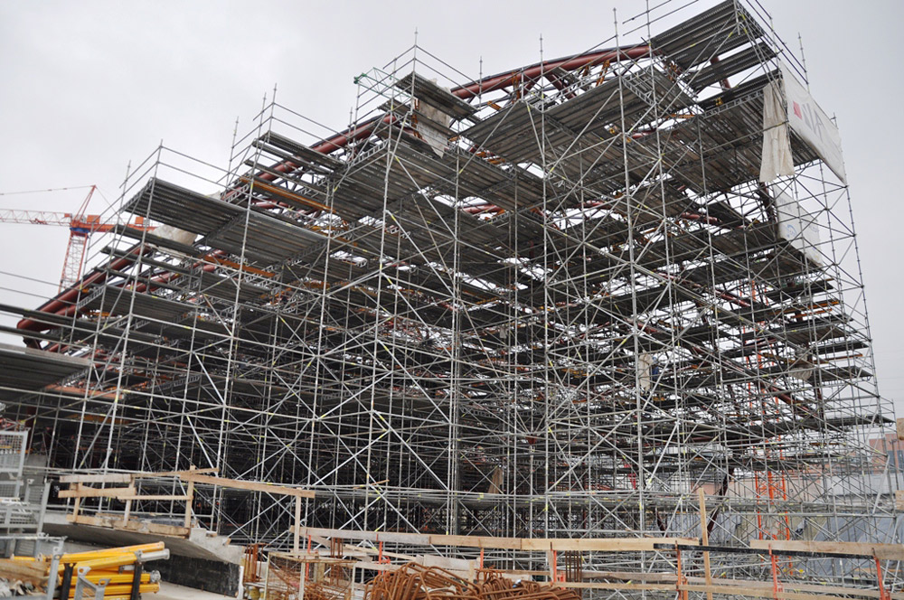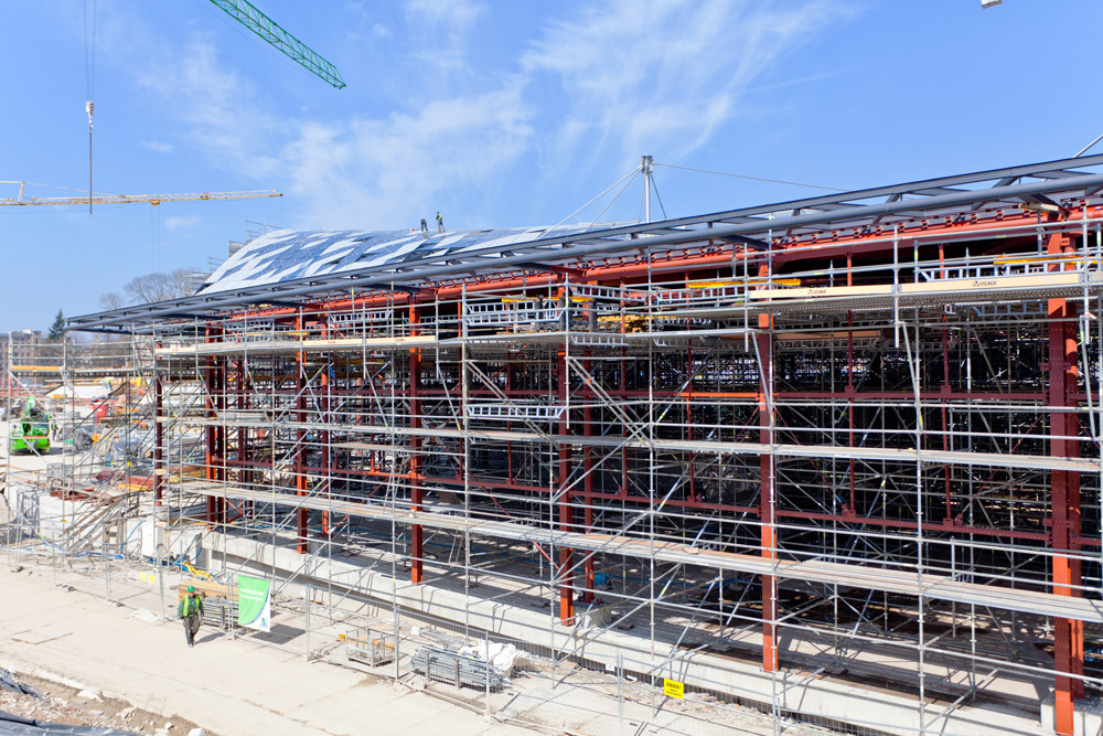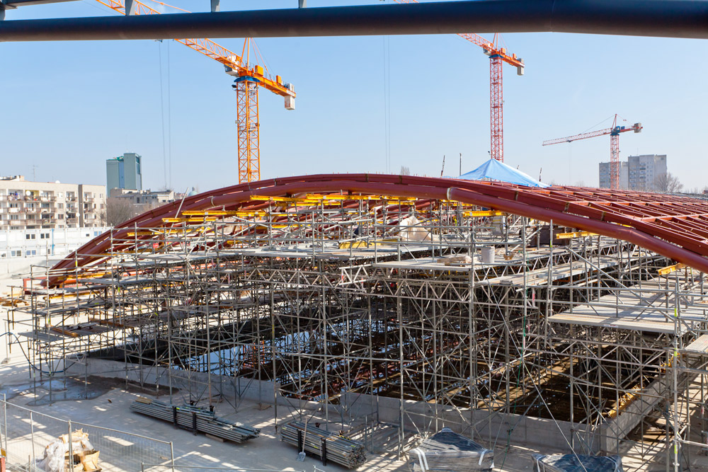 ULMA Construccion Polska S.A. dostarczyła na tę budowę 200 tys. m3 rusztowania modułowego BRIO, które znalazło zastosowanie podczas realizacji świetlika A o wymiarach 40 x 20 m i wysokości w szczycie około 17 m. Ze względu na wymagane obciążenia robocze platform podesty BRIO zostały oparte na systemowych ryglach o wzmocnionej konstrukcji, tworząc platformy montażowe z niezbędnymi drogami dojścia dla pracowników. Konstrukcja rusztowania o module 3,0 x 3,0 m została posadowiona na, wykonanych w systemie MK, 7 parach kratownic o rozpiętości 24,0 m i wysokości 2,8 m. Podstawki śrubowe rusztowania ustawione na ryglach MK zabezpieczono przed przesunięciem za pomocą złącz uniwersalnych. Konstrukcje MK zostały natomiast ułożone na łożyskach a te zespolono za pomocą śrub z przedłużkami 200 MK. W najniższym punkcie dwóch kratownic zewnętrznych, po jednej stronie zastosowano dwa HEB-y 320 połączone ze sobą za pomocą złączy uniwersalnych. Do uzyskania odpowiedniej wysokości zastosowano stopę regulowaną MK o nośności 360 kN połączoną z łożyskiem śrubami i osadzoną w belce oczepowej DHEB 160.