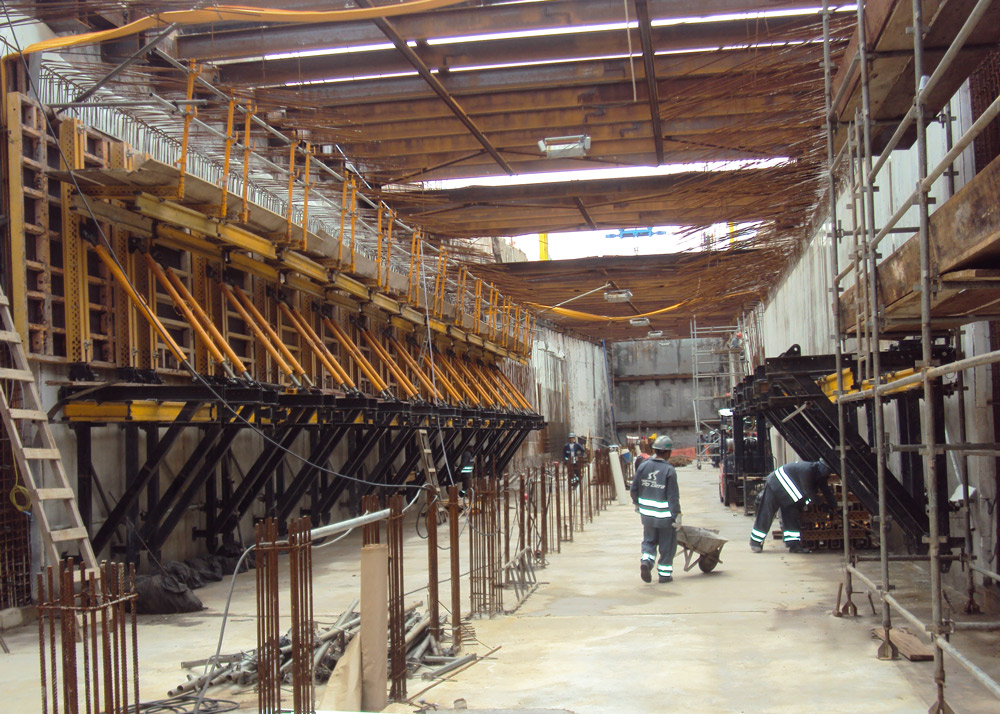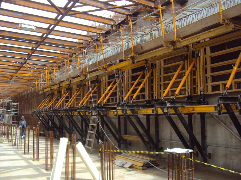 Ściany boczne tuneli o wysokości 5,7 m wykonane zostały przy użyciu deskowania ściennego ORMA. Elementy pionowe zostały zrealizowane w dwóch taktach. W pierwszym deskowanie ścienne zostało wyparte na kozłach oporowych SMK, w drugi – ustawione na konsolach dla deskowań jednostronnych SBF.