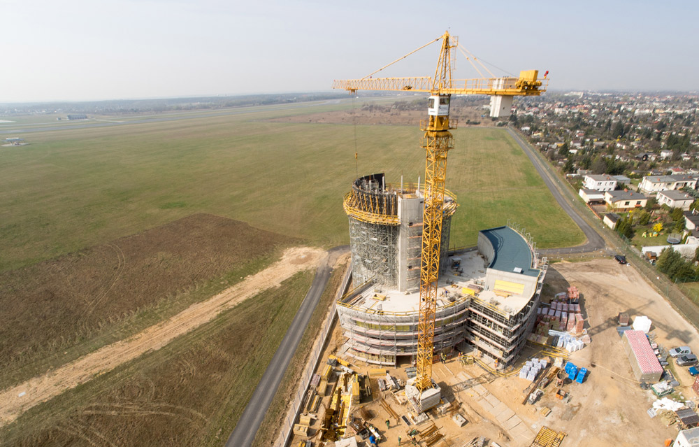 Na terenie portu lotniczego Poznań-Ławica powstaje niemal 36-metrowa wieża kontroli lotów. Inwestycję realizuje SKANSKA S.A. na zlecenie Polskiej Agencji Żeglugi Powietrznej. Obiekt został zaprojektowany w konstrukcji żelbetowej monolitycznej przez firmę inżynierską PROCHEM. Podstawę wieży stanowi budynek techniczno-administracyjny z podziemiem, natomiast bryła powyżej ma kształt nachodzących na siebie stożków. Zlokalizowany wewnątrz trzon żelbetowy umożliwi komunikację z salą operacyjną do sprawowania kontroli nad ruchem lotniczym, która spełnia również funkcję socjalno-wypoczynkową. Na samym szczycie wieży zaprojektowano taras. Łączna kubatura obiektów wyniesie 13,7 tys. m3, natomiast po- wierzchnia użytkowa około 2,5 tys. m2.