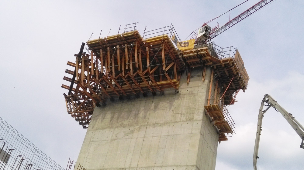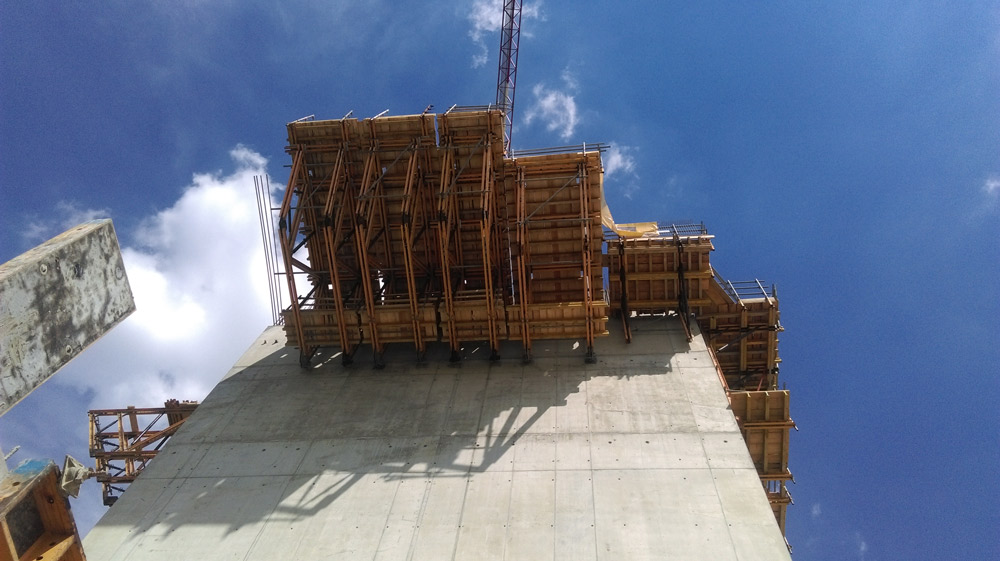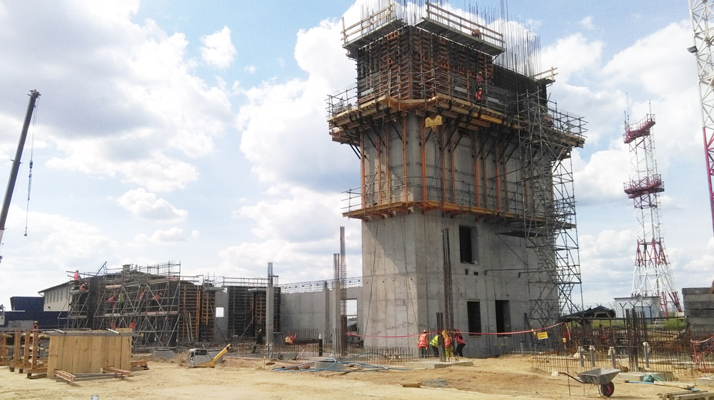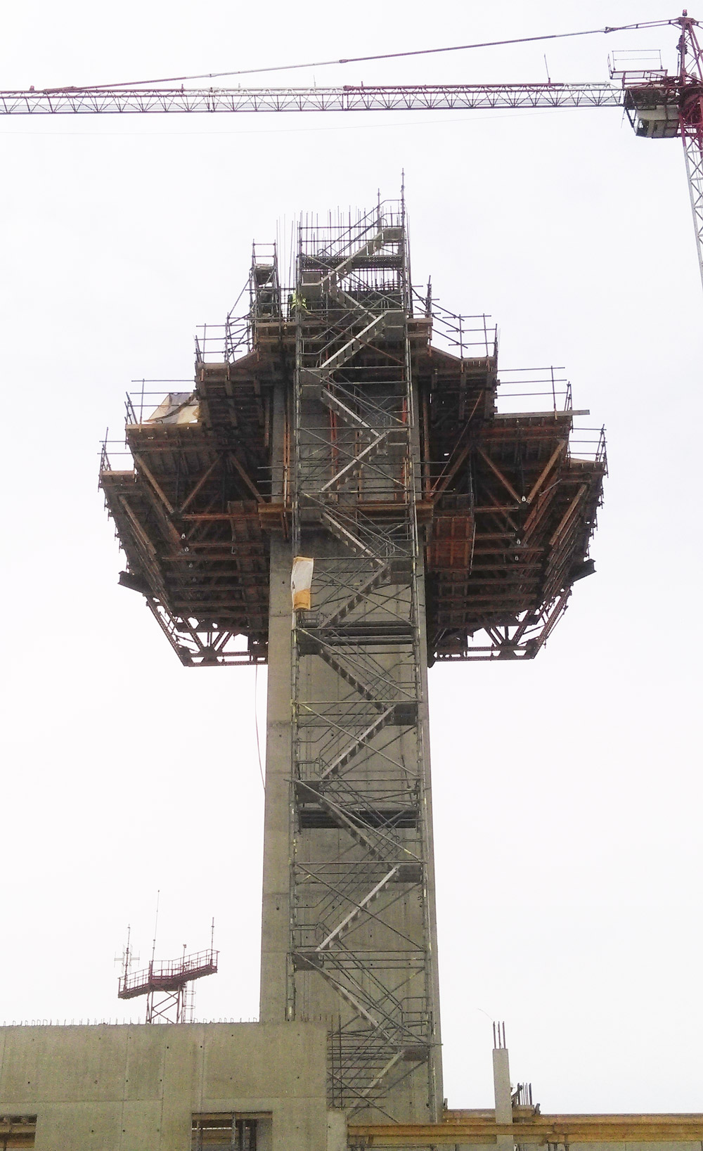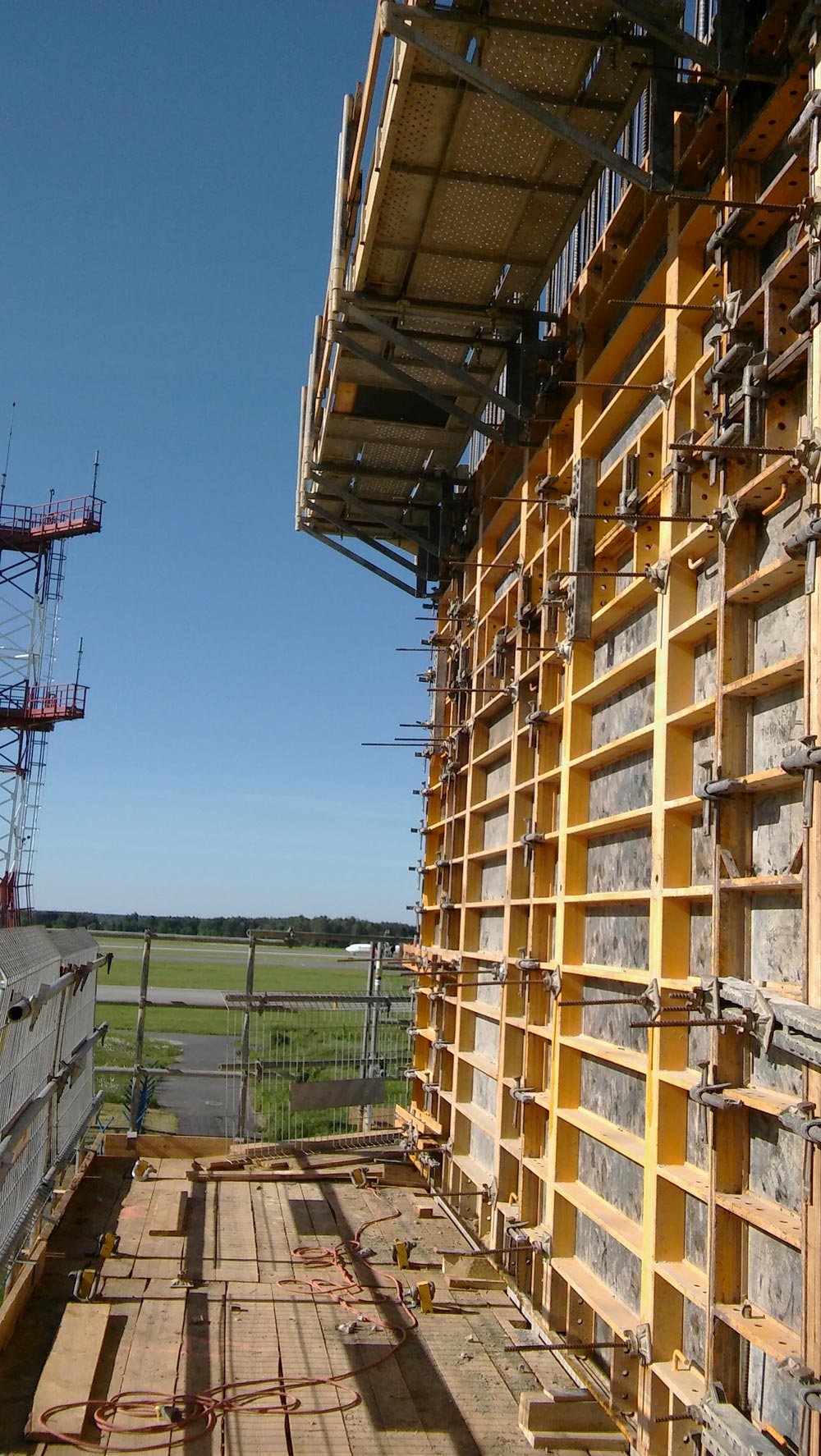 Podczas wykonywania ścian i słupów doskonale sprawdził się system PRIMO, natomiast przy budowie trzonu - system BMK wraz z podestami KSP. Zgodnie z założeniami wykonywano 2-3 przestawienia na trzonie za pomocą konsol BMK, po to aby wyprzedzić prace związane z wykonywaniem ścian i stropów budynku techniczno-administracyjnego. Deskowanie było za każdym razem demontowane, transportowane na wyższy poziom, a następnie przekładane na wcześniej przygotowane zakotwienia. Łączna ilość przestawień z udziałem BMK na trzonie wyniosła 7. Ostatni – 7 takt był niższy ze względu na konieczność osadzenia w wykonywanej ścianie zakotwień służących do podwieszenia kratownic. Zadaniem kratownic było przenoszenie obciążeń od belek sprężanych, stropu wraz z belką obwodową oraz ściany zewnętrznej. Zakotwiono je na dwóch poziomach (+28,075 i 28,585) tak, aby możliwe było prowadzenie prac z jednego poziomu. By zapewnić ciągłą komunikację dookoła trzonu, system kratownic uzupełniono konsolami BMK. Komunikacja pionowa na docelowy poziom roboczy odbywała się za pomocą schodni, sukcesywnie rozbudowywanej w miarę postępu prac. Od strony płyty lotniska, gdzie wysunięcie stropu poza obrys trzonu było największe zastosowano kształtowniki stalowe (kombinacja belek HEB 450, DIPE 450 oraz belek oczepowych 320). Ich zadaniem było przeniesienie obciążeń bezpośrednio na węzły kratownic. Kratownice dostarczone na budowę były uprzednio skręcone, a na placu budowy odbywał się ich dalszy montaż w tandemy i niezbędny osprzęt.