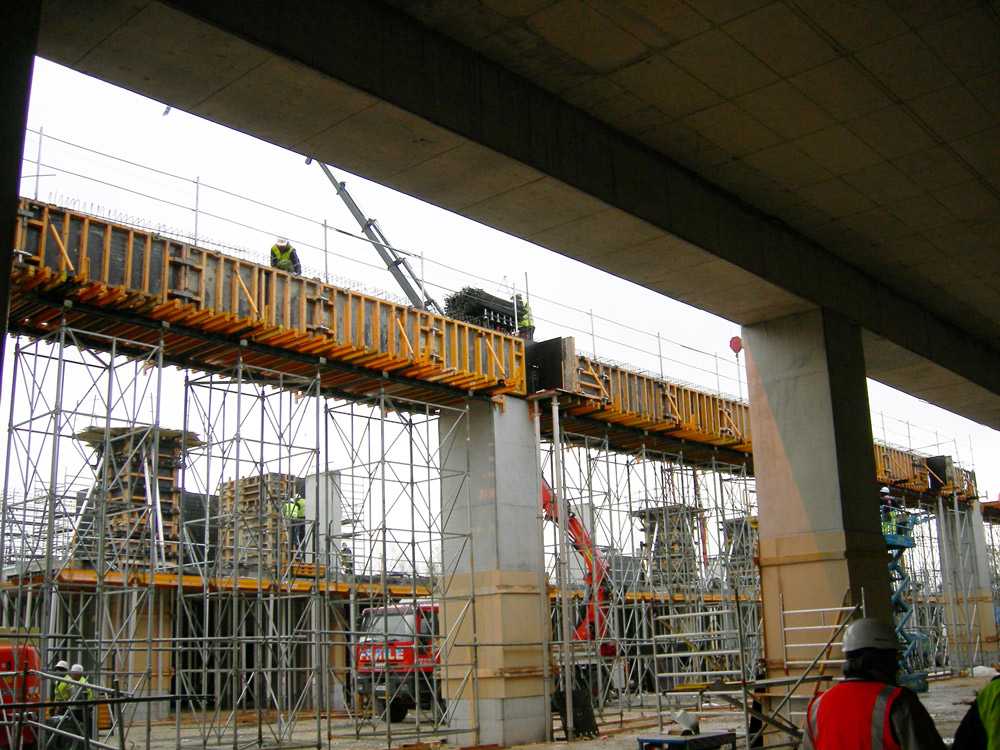 Do wykonania belek o wysokości 1,5 m, zaprojektowanych w technologii betonu architektonicznego, zastosowano uniwersalny system dźwigarowy ENKOFORM HMK. Deskowanie to doskonale sprawdza się zwłaszcza w budownictwie inżynieryjnym oraz we wszelkich projektach wymagających elastycznego dopasowania konstrukcji deskowania do kształtu wykonywanego obiektu.
