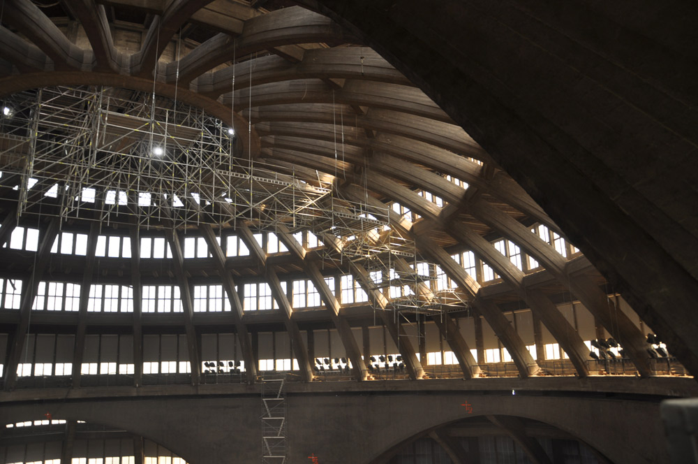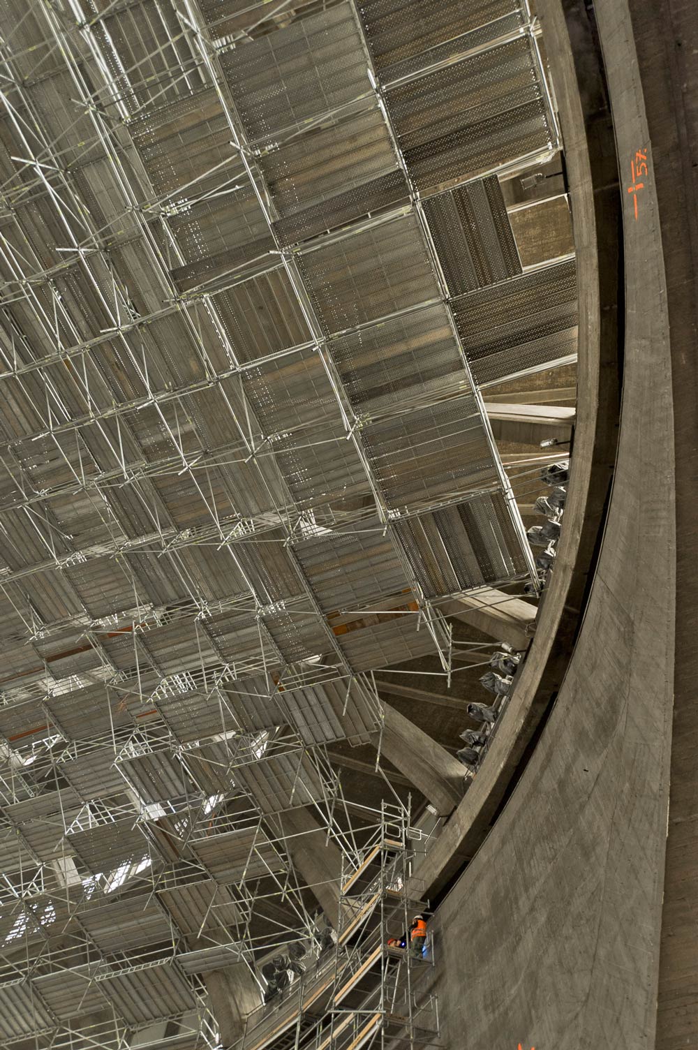 Montaż rozpoczęto od wysokości 40 m nad poziomem terenu, podwieszając rusztowanie na dźwigarach kratowych wspartych na górnym pierścieniu zwornikowym budynku. Uzyskano tym samym podstawę do wykonania platformy roboczej pod centralną częścią kopuły. Pozostała część rusztowania została podwieszona na linach stalowych do żelbetowej konstrukcji hali. W spodniej części rusztowania rozpięto chroniącą znajdujących się poniżej pracowników siatkę bezpieczeństwa. Montaż trwał 30 dni roboczych i był wykonywany nocą ze względu na prowadzone w ciągu dnia prace na poziomie „0”.