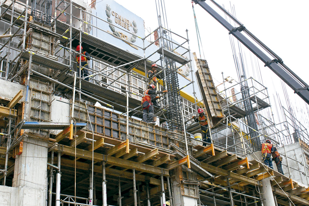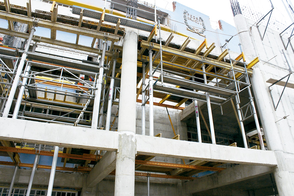 Elementy pionowe wykonano przy użyciu deskowania do montażu ręcznego COMAIN. Pomosty robocze do wykonywania prac na wysokości zostały wykonane na bazie rusztowania modułowego BRIO.