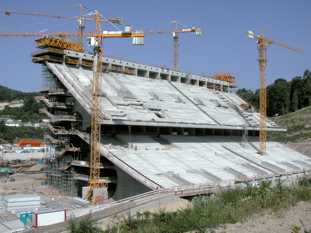 Zaprojektowany w dawnym kamieniołomie Stadion Futbolowy z miejscami dla ponad 30.000 widzów posiada dwie trybuny (wschodnią i zachodnią), boiska po obydwu stronach, trzy okrągłe poprzeczne galerie oraz dwa parkingi podziemne. Zadaszenie trybun podwieszono na kablach nad stadionem na wysokości 220 metrów.
