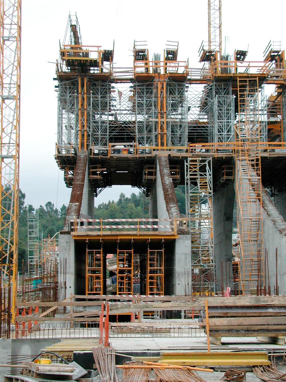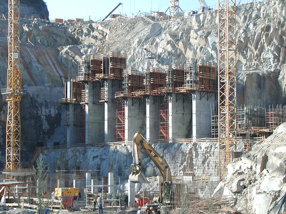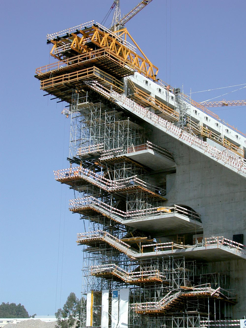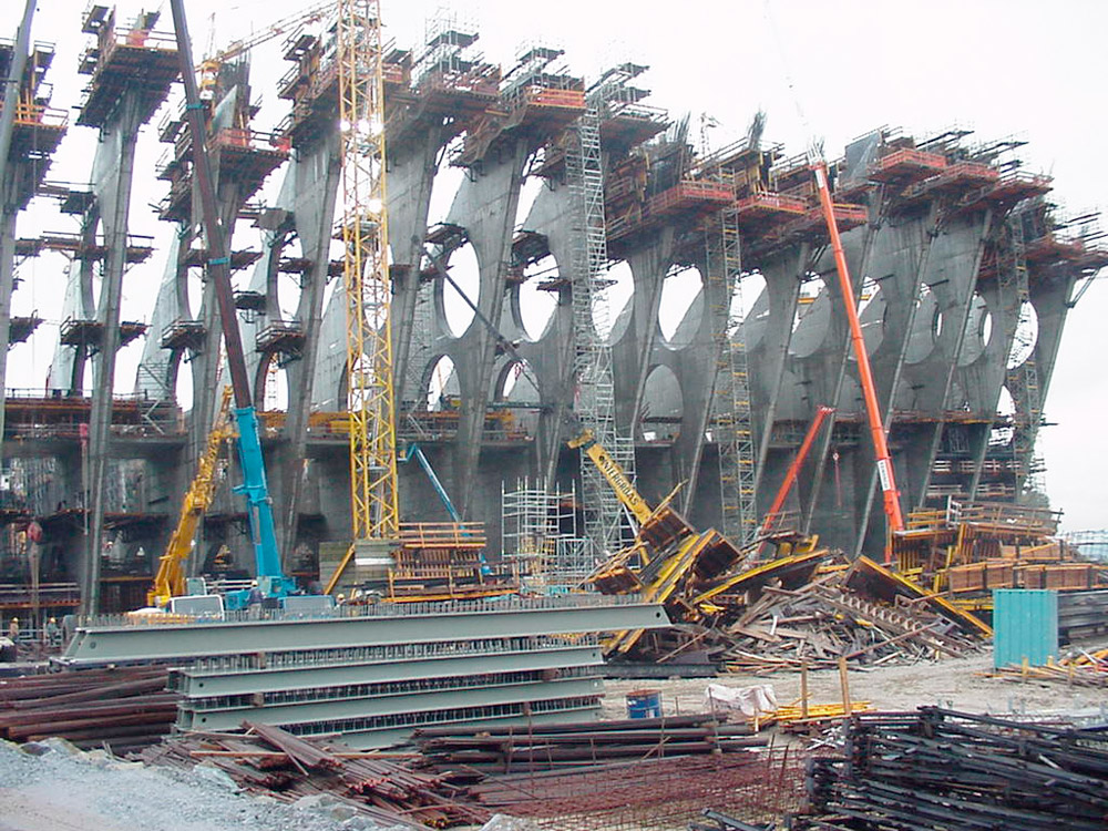 Na wysokości 30 m ściany tworzą 13-metrowy uskok, który rozwiązano w systemie ENKOFORM VMK. Elastyczność deskowania ENKOFORM V-100 pozwoliła na wykonanie tego obiektu o bardzo zróżnicowanej geometrii. Nachylone ściany zaplecza wykonano z zastosowaniem konsol G.
