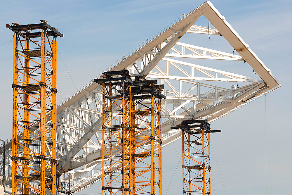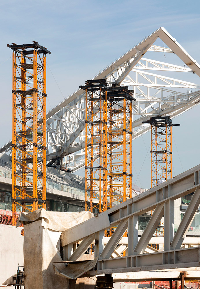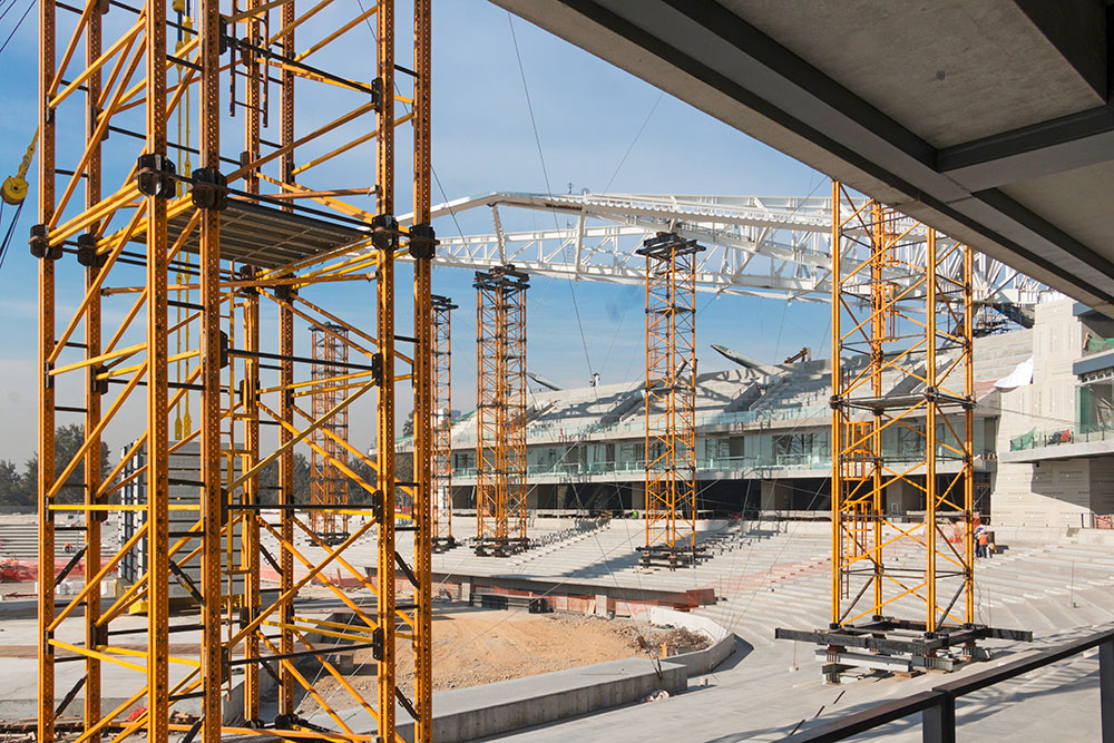 Na 12 wieżach podporowych wykonanych z elementów systemu MK spoczęło 8 dźwigarów dachu o wadze 550 ton każdy. W zależności od rozkładu obciążeń zaprojektowano wieże o 4 lub 8 stopach i wysokości do 26 metrów. O ich wytrzymałości i nośności świadczy to, że bez problemu wytrzymały dwa wstrząsy sejsmiczne o magnitudzie 7,1 w skali Richtera, które spowodowały znaczące zniszczenia w mieście Meksyk i innych prowincjach.