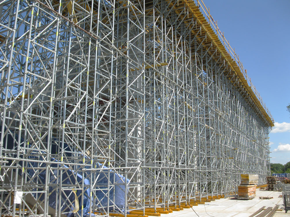 Z uwagi na napięty harmonogram prac inne elementy konstrukcyjne pod “ringiem”, jak na przykład schody na trybuny czy wylewane podciągi wykonywano rownolegle. Niemal jednoczesna realizacja “ringu” na 3 trybunach wymagała dużego zaangażowania logistycznego i sprzętowego. Elementy systemowe wykorzystano rownież do podparcia montażowego stalowych dźwigarow kratowych, stanowiących głowne elementy nośne dachu nad trybunami. Prace montażowe były prowadzone w siedmiu etapach.