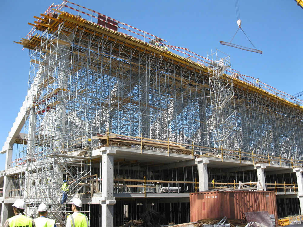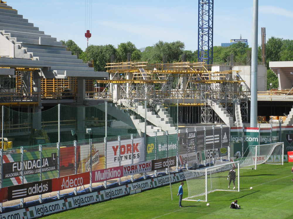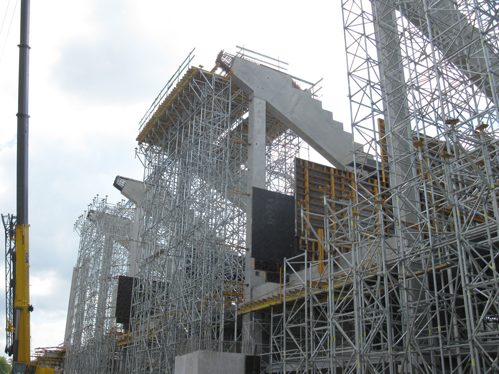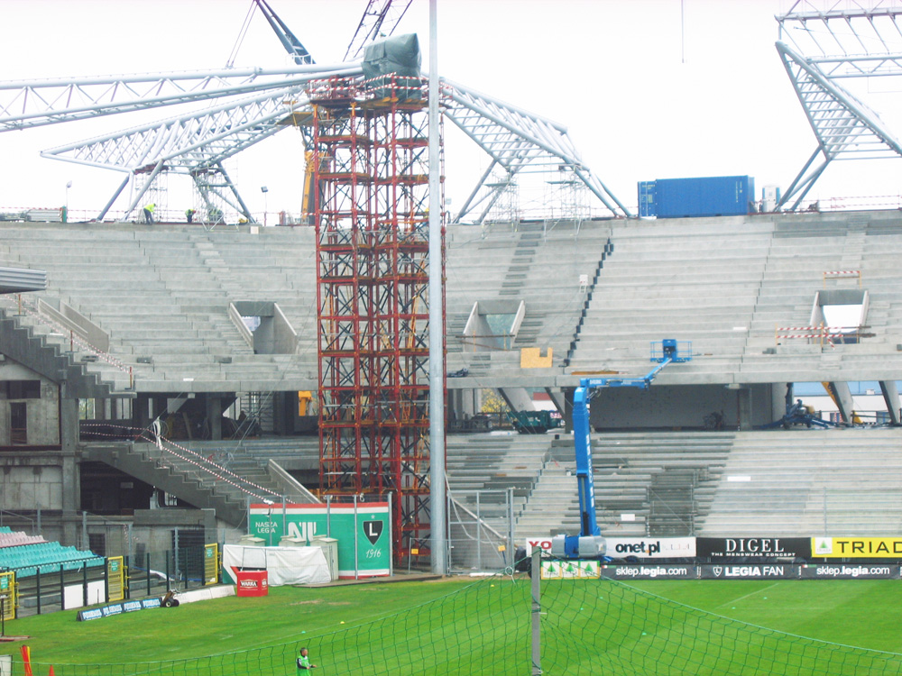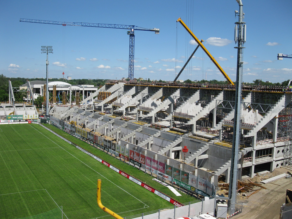 Prace żelbetowe rozpoczęły się jednocześnie na trzech trybunach (połnocnej, południowej i wschodniej). Płyty i ławy fundamentowe, ściany oraz szyby windowe wykonywano przy użyciu systemu deskowania ściennego NEVI. Z uwagi na wymogi architektoniczne nie pozwalające na użycie ściągow, słupy monolityczne 60 x 80 cm wykonano w systemie ORMA. Możliwe jest wowczas uzyskanie maksymalnego wymiaru słupa 115 x 115 cm.