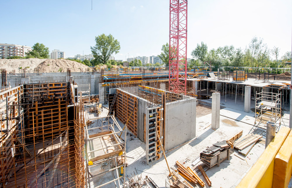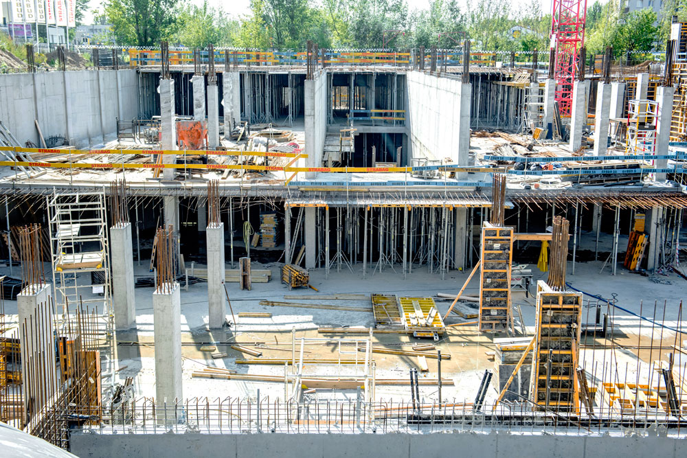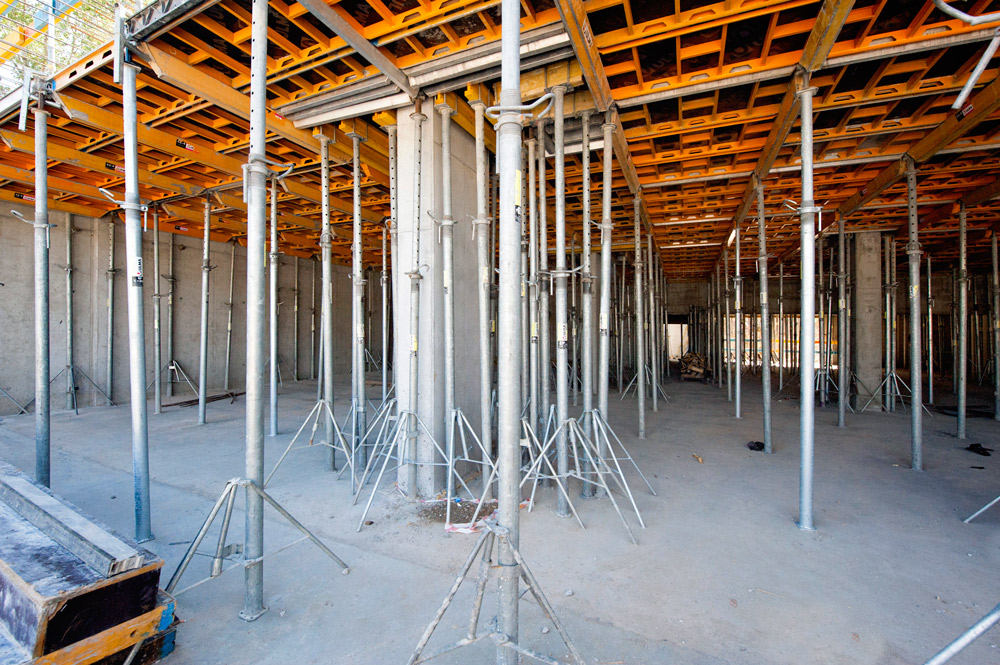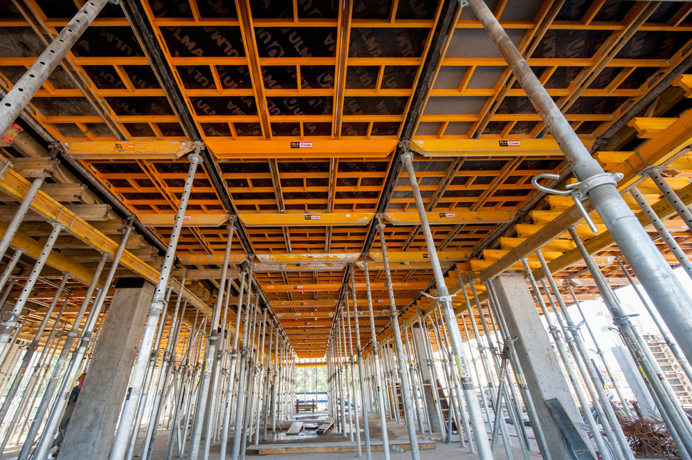 Przy budowie ścian budynku wynoszących od 3,5 do 4 m doskonale sprawdził się system ORMA. W sumie na budowę dostarczono przeszło 400 m2 deskowania ściennego. Stropy, o powierzchni 6000 m2 na jednej kondygnacji, zostały zrealizowane za pomocą deskowania panelowego CC-4. Dzięki głowicy opadowej możliwa była szybka rotacja systemu na budowie. Firma ULMA dostarczyła w sumie 3.500 m2 deskowania stropowego.