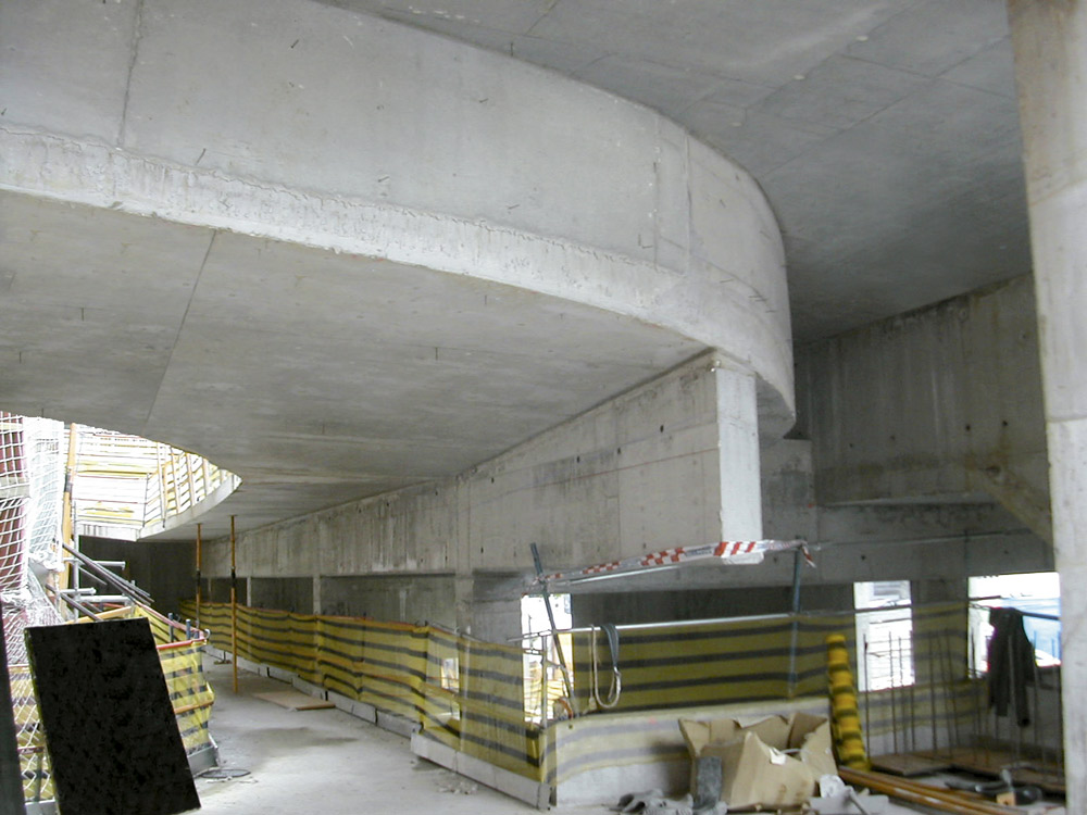 Do formowania ścian zakrzywionych oraz nachylonych wykorzystano deskowanie ENKOFORM VMK. Część elementów była montowana na budowie, a część przysłana na budowę po pierwomontażu. System doskonale sprawdził się przy wykonywaniu elementów o złożonych kształtach przy dużym parciu betonu.