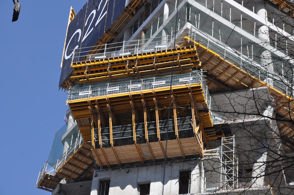 Do wykonania głównych elementów nośnych budynku, tj. czterech trzonów klatkowo-windowych wraz z szachtami instalacyjnymi ULMA zaproponowała systemy samowznoszące ATR i RKS. Utrudnienie stanowił fakt, iż do każdej z czterech sekcji należało podejść indywidualnie.