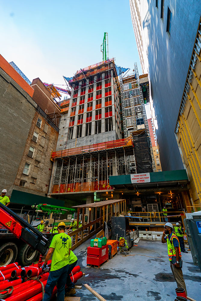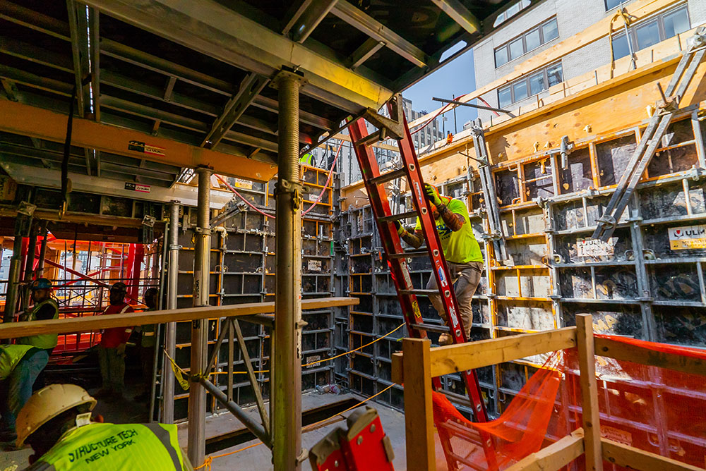 Stropy o regularnym kształcie i dużej powierzchni wykonano przy użyciu łącznie 9 755 m² aluminiowego deskowania panelowego CC-4, którego podparcie stanowiły podpory ALUPROP o niskiej masie i wysokiej nośności. Ściany i słupy zrealizowano wykorzystując ogółem 2 438 m² deskowań ramowych MEGALITE. System samowznoszący RKS, idealne rozwiązanie do obiektów wysokich, posłużył do realizacji zewnętrznego trzonu budynku oraz jego wewnętrznej części, stanowiącej szyb windy. Jako zabezpieczenie krawędzi stropów świetnie sprawdziły się osłony przeciwwiatrowe HWS – na budowę ULMA dostarczyła 25 osłon, każda o wymiarach 5 x 15 m.