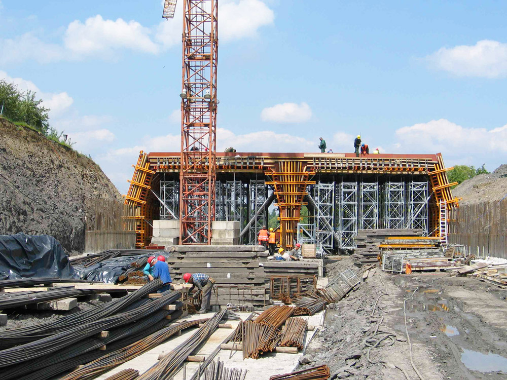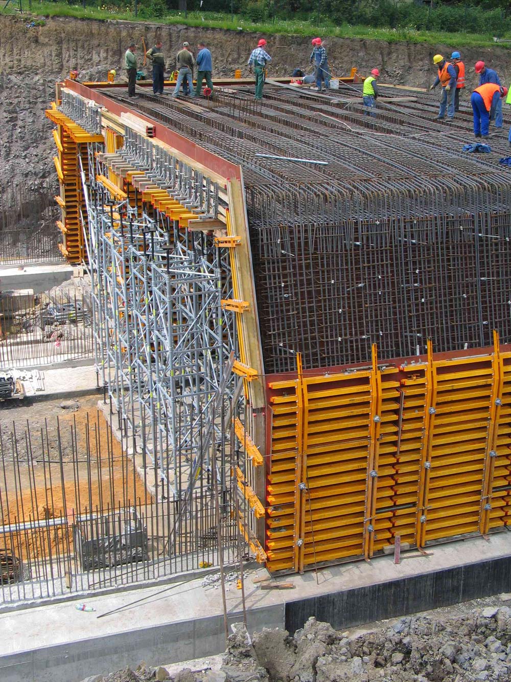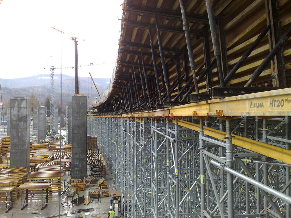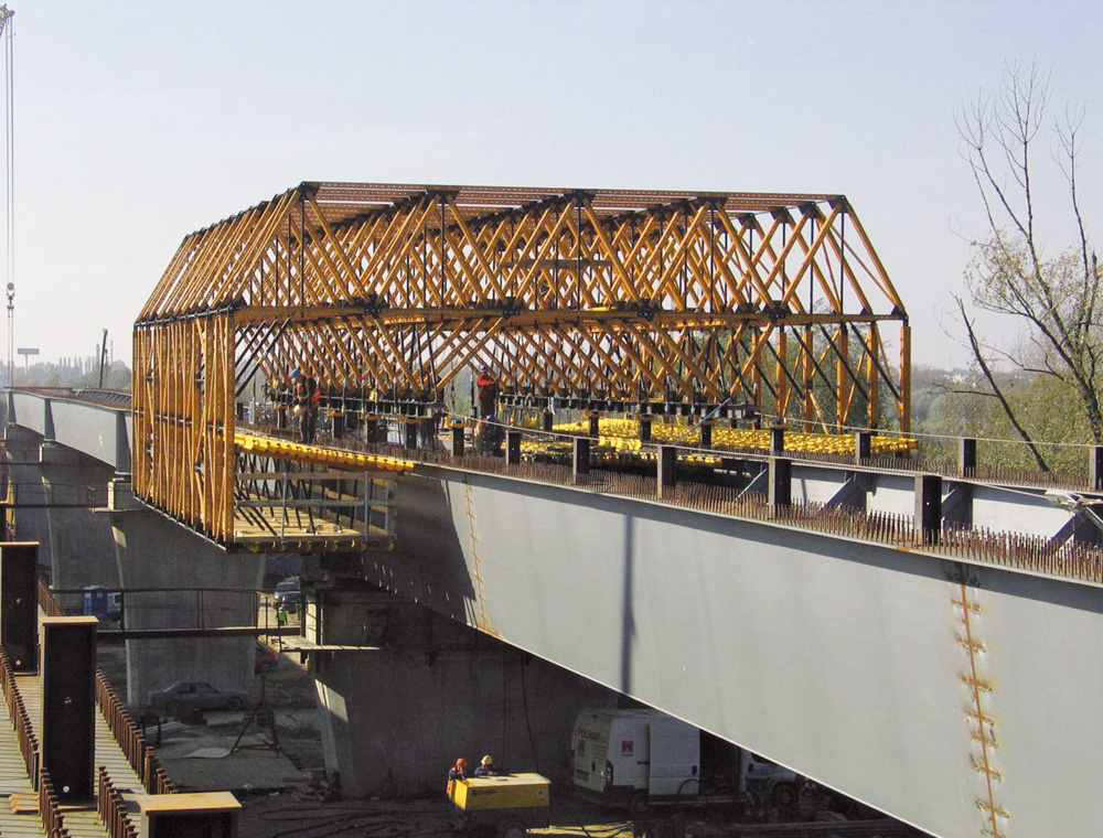 Deskowanie płyty pomostu wykonano w oparciu o system ENKOFORM HMK, który można dostosować do dowolnych przekrojów przy użyciu standardowych elementów. Deskowania ustawiono na wieżach T-60 o wysokości do 15 m.