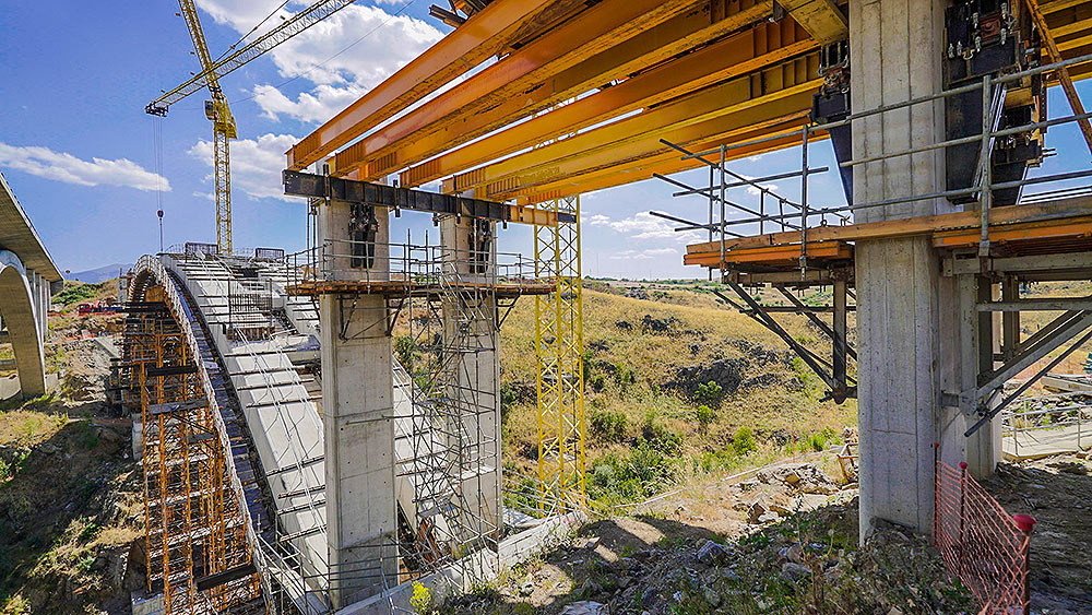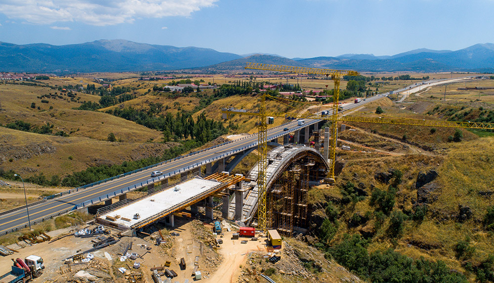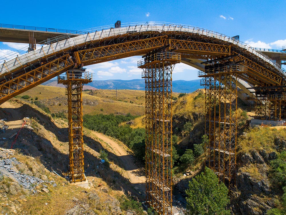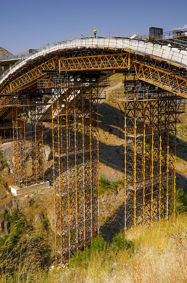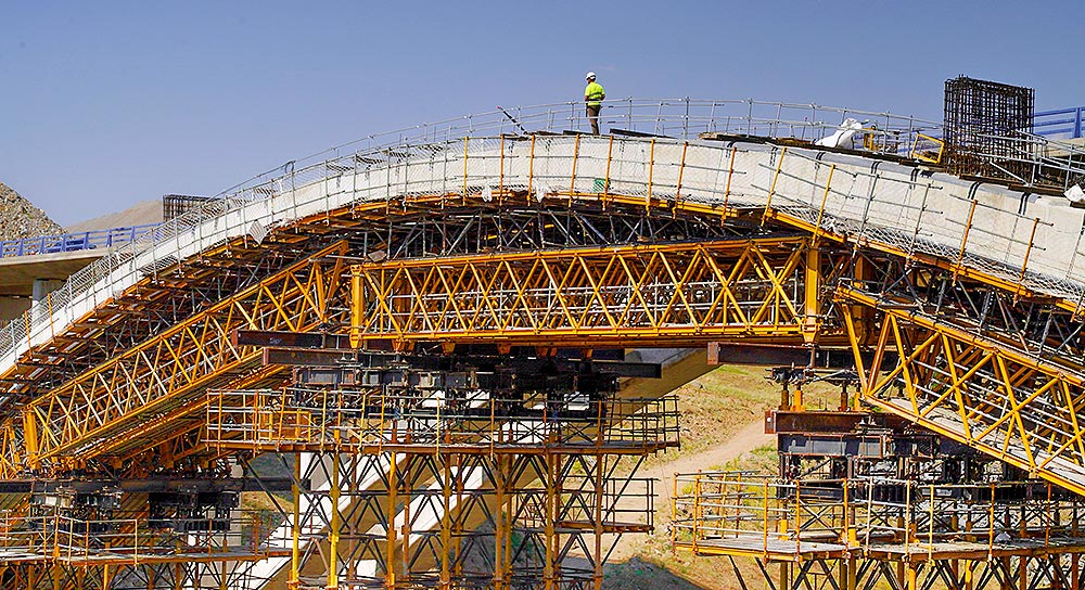 Z uwagi na trudne warunki terenowe ULMA zaprojektowała indywidualne rozwiązanie w postaci dźwigara kratowego i wież podporowych wspartych na stopach fundamentowych. Wymagany kształt łuku został uzyskany dzięki zastosowaniu dźwigarów H-33 o długości 20 m oraz podwójnemu deskowaniu. Jako podparcie zostały wykorzystane wieże T-500, które mimo 40-metrowej wysokości nie wymagały stężenia. Jedynie pięć wież wystarczyło do podparcia pełnej długości łuku.