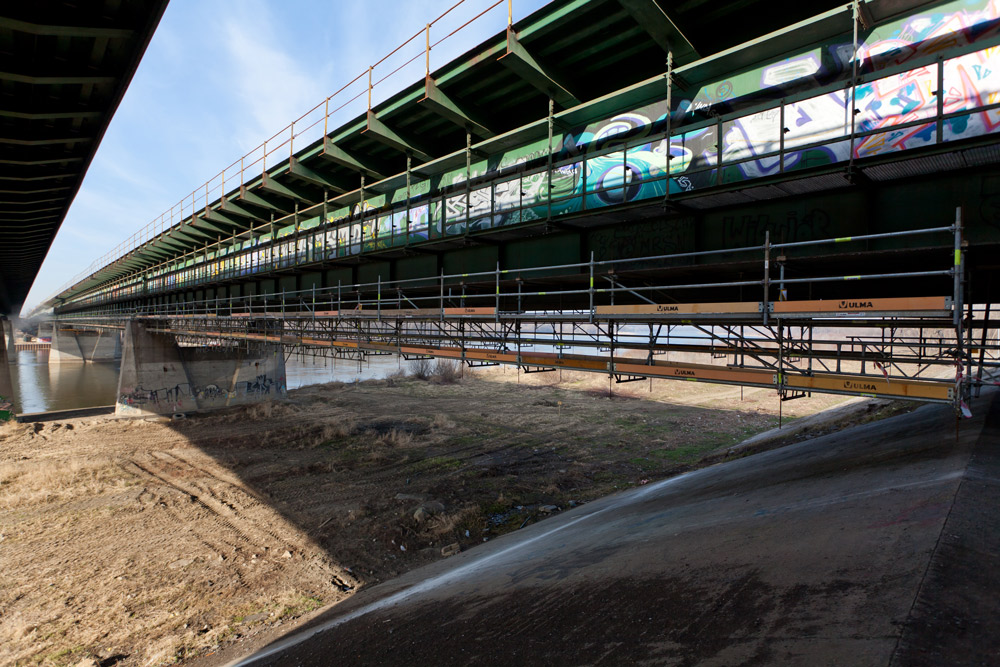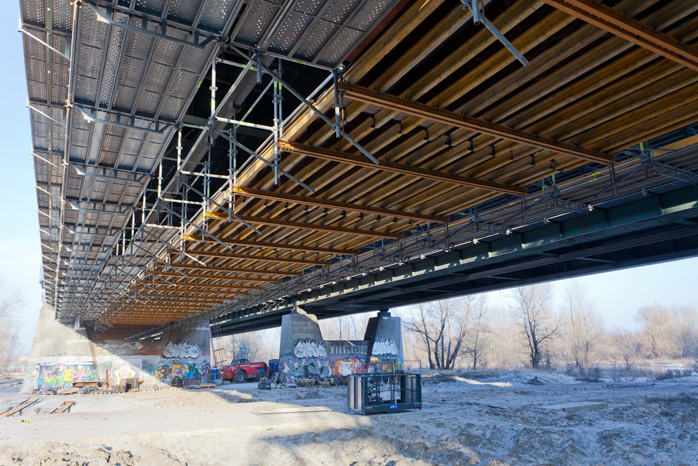 Rusztowanie zewnętrzne wykonano w systemie BRIO, a jego poszczególne moduły zostały podwieszone do konstrukcji mostu za pomocą kombinacji rur i złączy. Dolną część rusztowania zamocowano do blachownicy mostu za pomocą elementu z blachy grubości 10 mm, zaprojektowanego na potrzeby tej inwestycji, natomiast przestrzeń między blachami wypełniono sklejką zapewniającą odpowiednią geometrię złącza. Górną część rusztowania usztywniono za pomocą układu rur zamocowanych do wsporników mostu. Stabilizację dolnej części zrealizowano za pomocą zastrzału (rura 48,3 x 3,2) mocowanego do dolnej konstrukcji mostu. W przęsłach nurtowych do montażu rusztowania wykorzystano otwory w blachach poszycia mostu. Przez otwory zostały przepuszczone ściągi, zabezpieczone pomocą nakrętek D75. Na ściągi nałożono słupki rusztowania, do których przymocowano dźwigary, a na nich ułożono podesty. W kierunku podłużnym rusztowanie usztywniono za pomocą stężeń systemowych.