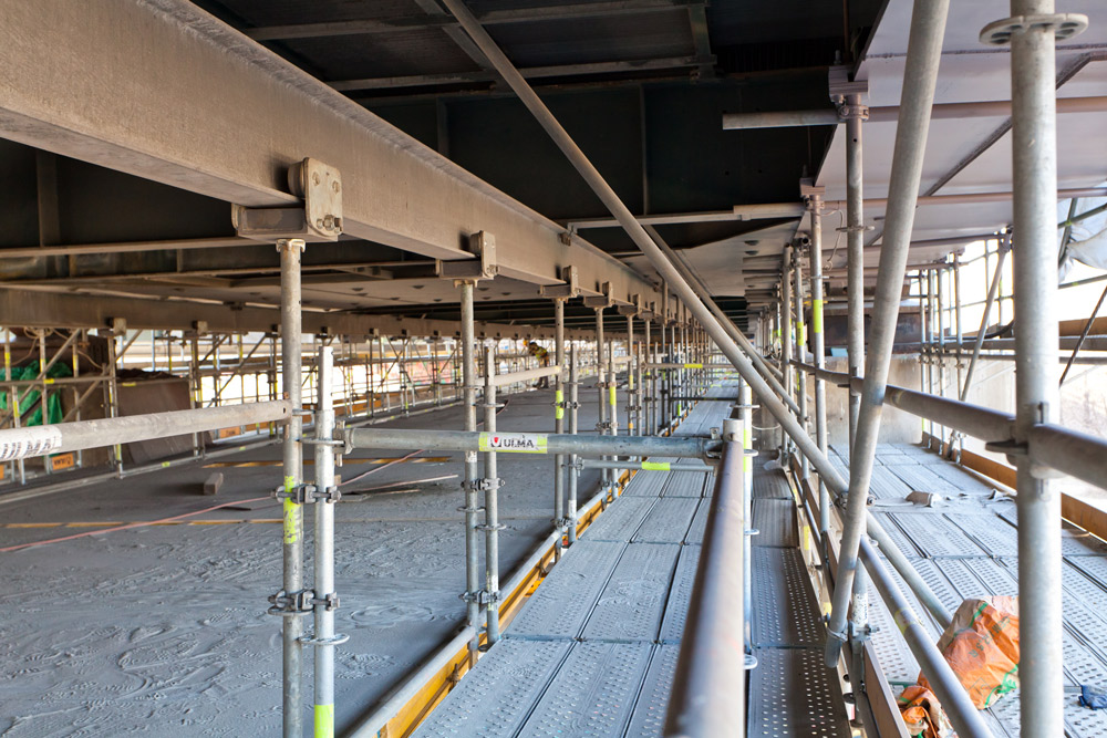 W Warszawie trwają prace związane z modernizacją mostu im. gen. S. Grota-Roweckiego. Na potrzeby tych prac (m. in. piaskowanie i malowanie konstrukcji, prace spawalnicze, sprężanie mostu oraz poszerzenie jezdni) podwykonawca (B7 Sp. z o.o.) zlecił firmie ULMA zaprojektowanie i dostarczenie rusztowania składającego się z dwóch części: rusztowania zewnętrznego oraz platformy podwieszanej do konstrukcji mostu od spodu przęsła.