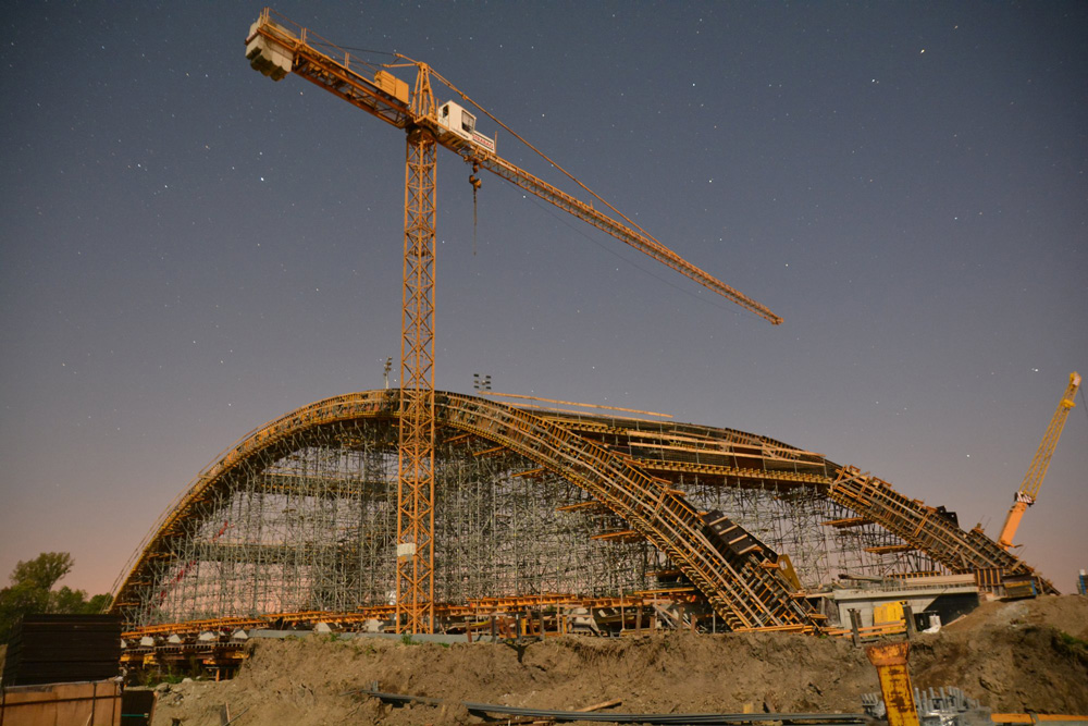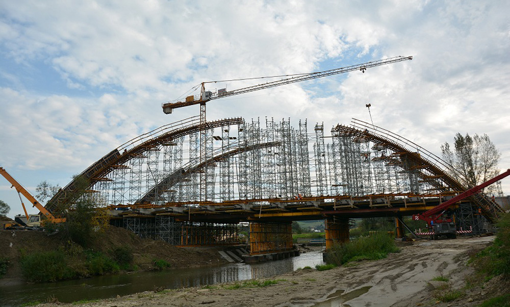 Do realizacji skrajnych podpór użyto głównie blatów deskowania ramowego PRIMO. Konstrukcję nośną deskowania poprzecznic stanowi ruszt stalowo-drewniany z dźwigarów VM 20 oraz rygli DSD, połączonych ze sobą łącznikami systemowymi DSD. W skrajnych osiach mostu podparcie rusztu pod płytą stanowią wieże T-60 o module 1 x 1,5 m. W przęsłach centralnych, tj. od 1. do 5. osi, podparcie stanowi ruszt z profili stalowych na podporach wysokonośnych S-40. Do wykonania poprzecznic użyto systemów deskowań ramowych PRIMO i NEVI. Deskowanie płyty pomostu, podobnie jak szalunek poprzecznic, zostało usytuowane na ruszcie stalowo-drewnianym z dźwigarów i rygli. Do podparcia rusztu w sektorach skrajnych obiektu również użyto wież T-60 o 2 modułach wymiarowych 1 x 1,5 m oraz 1,5 x 1,5 m. Natomiast w części centralnej podparcie rusztu pod płytą zaprojektowano w postaci pasów z rygli MK połączonych ze sobą na długości złączami 90 MK. Deskowanie łuków oraz wiatrownic zaprojektowano jako ruszt stalowo-drewniany z obustronnymi pomostami roboczymi. Konstrukcję nośną rusztu stanowią krążyny stalowe z rygli MK, podpór pionujących E oraz łączników systemowych MK uformowanych w kształcie łuku. W części centralnej łuku zastosowano ruszt prosty z dopasowaniem do jego geometrii poprzez odpowiedni wysuw trzpieni wież podporowych. Ruszt górny wykonano z dźwigarów VM 20 (podsklejkowych) w rozstawie co 25 cm. Dla uzyskania żądanego promienia łuku, do dźwigarów zostały przybite drewniane listwy formujące krzywiznę sklejki. Deskowanie boczne łuku i wiatrownic zrealizowano przy użyciu systemu ramowego PRIMO i NEVI. Zamknięcie deskowania od góry na odcinkach łuków o dużej pochyłości zostało wykonane ze sklejki i kantówek mocowanych do rygli, zapiętych do płyt szalunkowych ściągami czołowymi oraz kotwionymi do rusztu ściągami DW15. Podparcie deskowania zrealizowano przy użyciu wież podporowych T-60 o modułach wymiarowych 1 x 1 m oraz 1 x 1,5 m. Wieże pod łukami ustawione są w osi, na wymianach z rygli MK od poziomu belek oczepowych HEB 320 ułożonych na poprzecznicach. Wieże pod wiatrownicami ustawione są natomiast bezpośrednio z poziomu płyty pomostu. W miejscach połączenia wiatrownic z łukami zastosowano dodatkowe podparcie z podpór ALUPROP pod ryglami ułożonymi na wspornikach T-60 od strony wewnętrznej łuku.