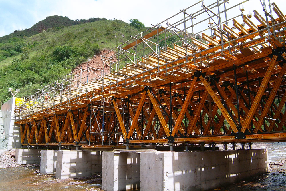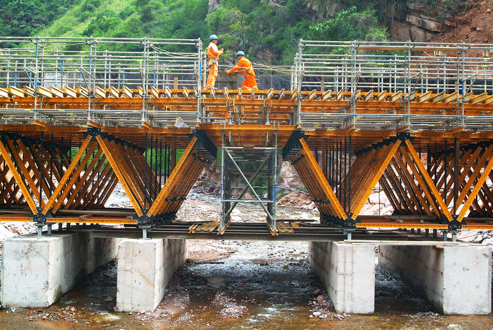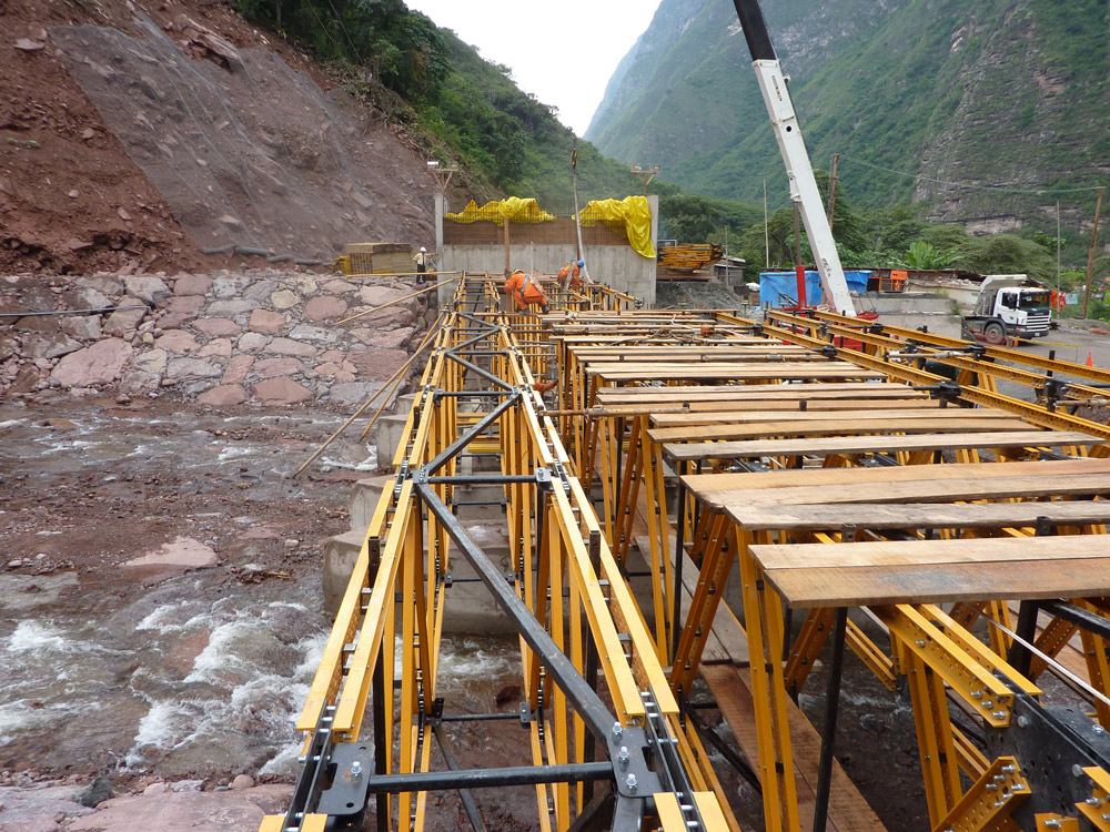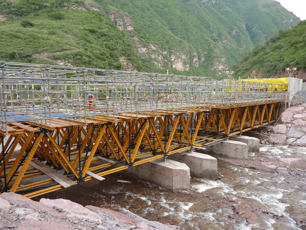 Konstrukcję wsporczą wykonano na bazie kratownic MK. Usztywnione elementy o szerokości 2,6 m oparto na betonowych fundamentach tymczasowych rozmieszczonych w korycie rzeki. Na poprzecznych kratownicach MK ułożono drewniane dźwigary VM-20, które stanowiły podparcie dla wież BRIO. Na konstrukcji ustawiono deskowanie COMAIN, które posłużyło do zaformowania spodu i boków dźwigara mostu.