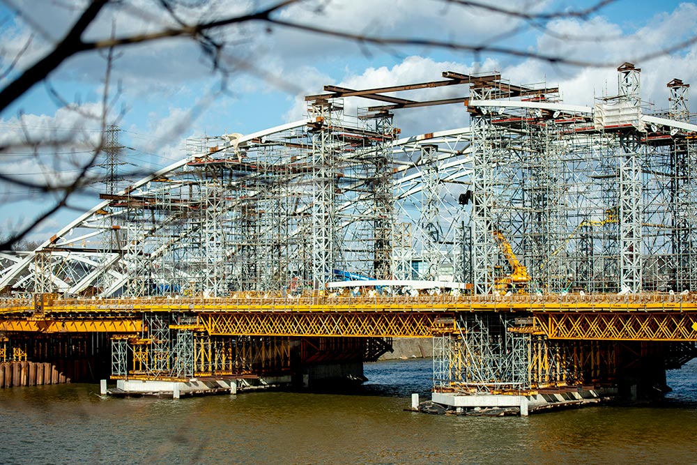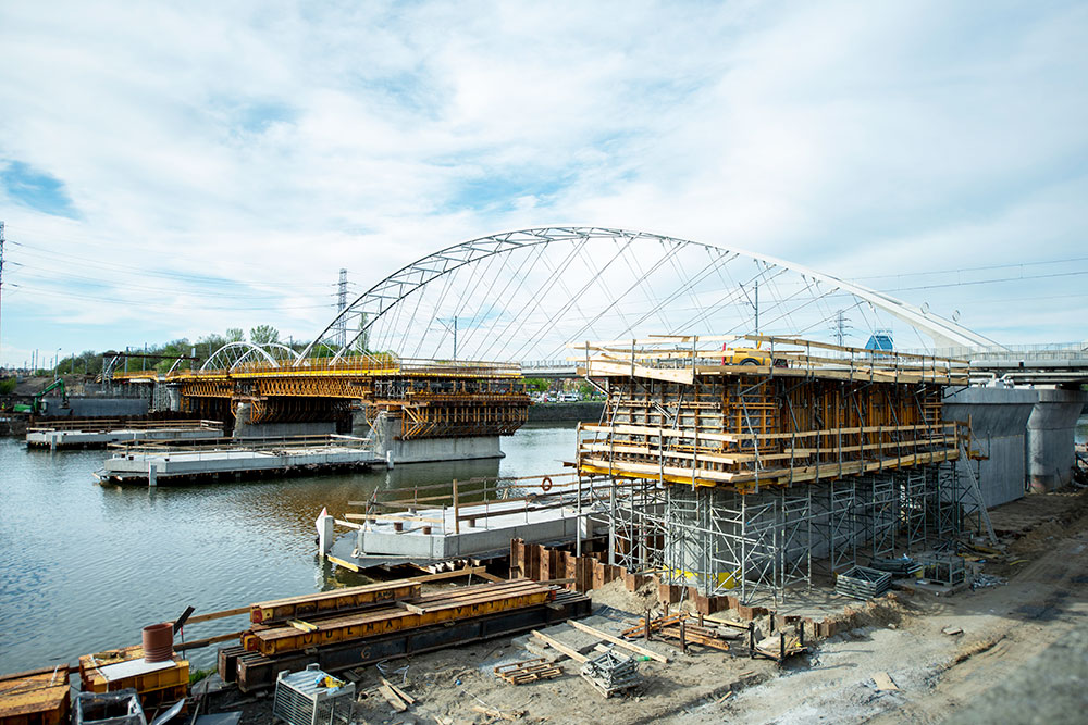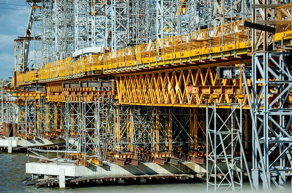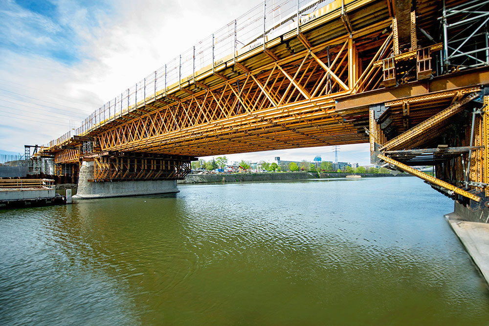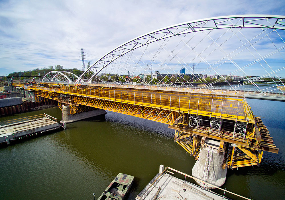 Konstrukcję wsporczą deskowania płyty obiektu M1 zaprojektowano w formie bramek technologicznych nad Wisłą, Obiekt składa się z czterech przęseł o rozpiętości w osiach konstrukcyjnych wynoszących: 30,9 + 37,8 + 36,3 + 11. Trzy przęsła realizowane były na bazie kratownic H33 (o długości 30 i 24 m) i jedno przęsło z wykorzystaniem blachownic TAC (o długości 12 m). Posadowienie kratownic H33 i blachownic TAC zaprojektowano na istniejących w nurcie rzeki podporach starego mostu, które zaadaptowano na potrzeby budowy. Po jej zakończeniu zostaną one rozebrane. Deskowanie poziome obiektu zostało wykonane w formie rusztu stalowo-drewnianego z wykorzystaniem dźwigarów drewnianych VM-20, rygli oraz łączników stalowych systemu DSD 12/20.