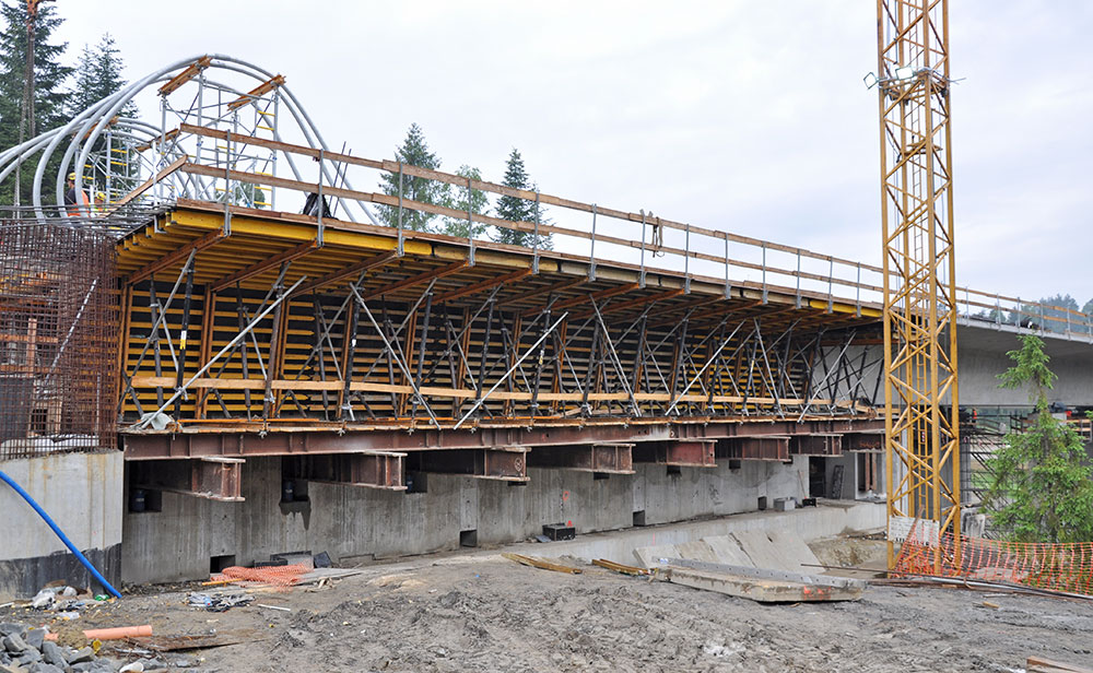 Niezwykle uniwersalny system MK doskonale sprawdził się do zaprojektowania formy szalunkowej, o długości 24 m. Do budowy formy wykorzystano nowatorskie rozwiązanie umożliwiające jednoczesne rozszalowanie płyty dennej oraz środników ze skrzydełkami. Zastosowanie głowic rozformowujących na belkach ślizgowych umożliwiało odsuwanie deskowania środników ze skrzydełkami w czasie opuszczania podłogi ustawionej na siłownikach. Zastosowane rozwiązanie pozwalało na rozformowywanie formy w czasie krótszym niż 30 min. Ponowne ustawienie i zniwelowanie deskowania zajmowało niecałe 3 godzin. Deskowanie części środkowej zaprojektowano w formie przejezdnej szuflady. Deskowanie uniwersalne HMK oparto na wspornikach rolkowych, umożliwiających swobodne przemieszczenie szalunku na wykonaną część ustroju. Filary mostowe realizowano w taktach o wysokościach z zakresu od 5.5 do 8 metrów przy wykorzystaniu systemu konsol BMK.