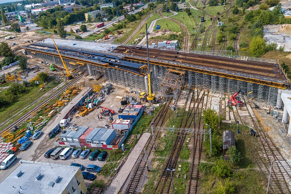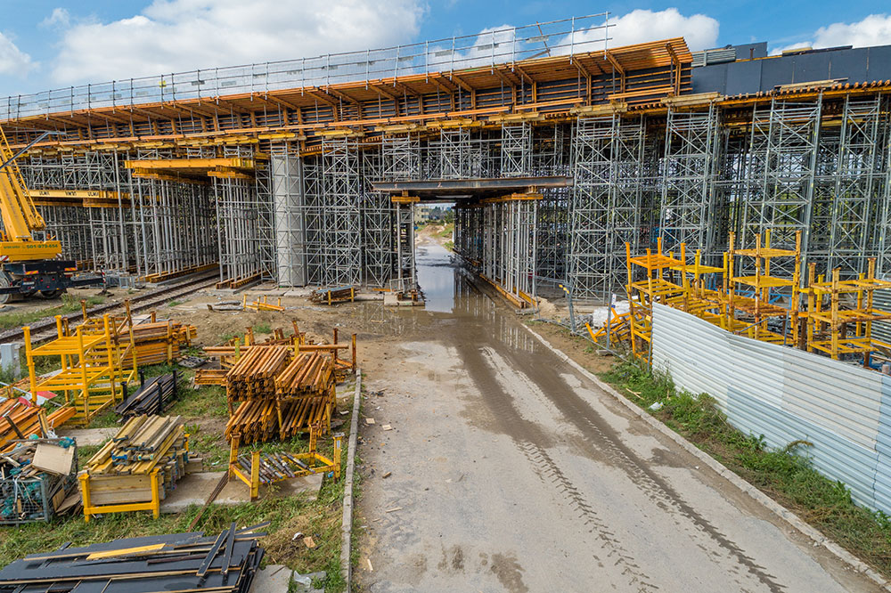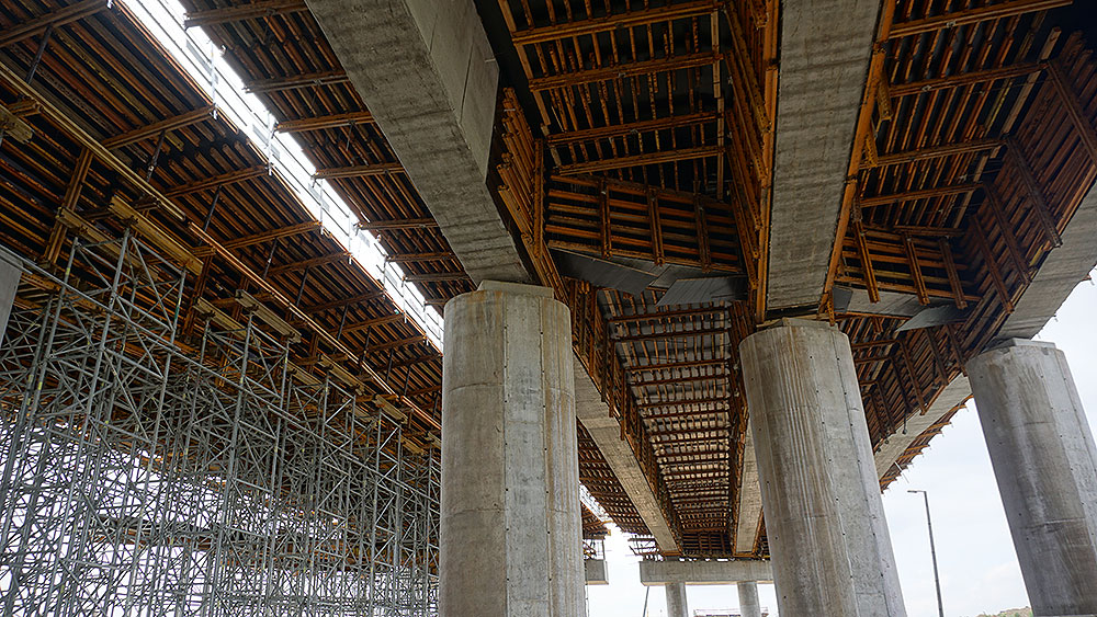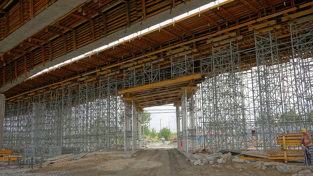 Ustrój nośny obiektu zrealizowano przy użyciu systemu szalunków HMK, który bazuje na uniwersalnym systemie MK. Deskowanie ustroju nośnego oparte zostało na wieżach T-60, których wysokość dochodziła do 8 m. Na obiekcie zastosowano wieże w dwóch kombinacjach przekrojów; 1,0 x 1,0 m oraz 2,0 x 1,0 m, co pozwoliło na ograniczenie ilości potrzebnych do realizacji elementów podporowych. Podczas projektowania deskowania, należało uwzględnić konieczność zachowania ruchu pociągowego przebiegającego pod realizowanym wiaduktem. Bramki przejazdowe wykonano na bazie wież aluminiowych ALUPROP, na których ułożono profile stalowe. Podczas realizacji owalnych filarów doskonale sprawdził się system TUBUS. Łupiny dostarczone na budowę miały średnicę 1600 cm.