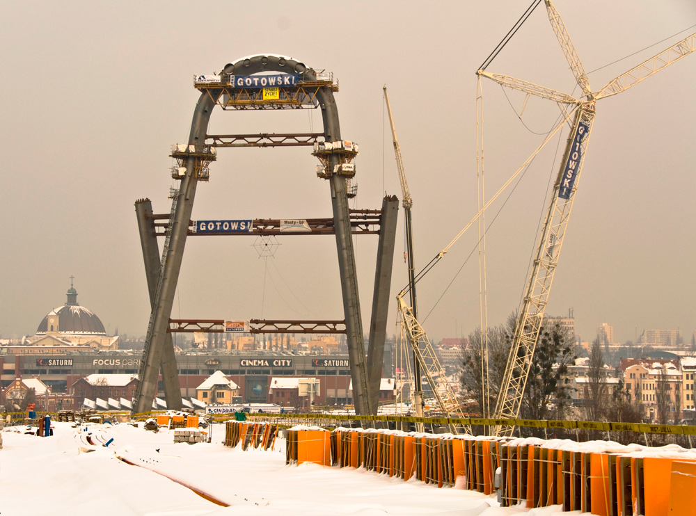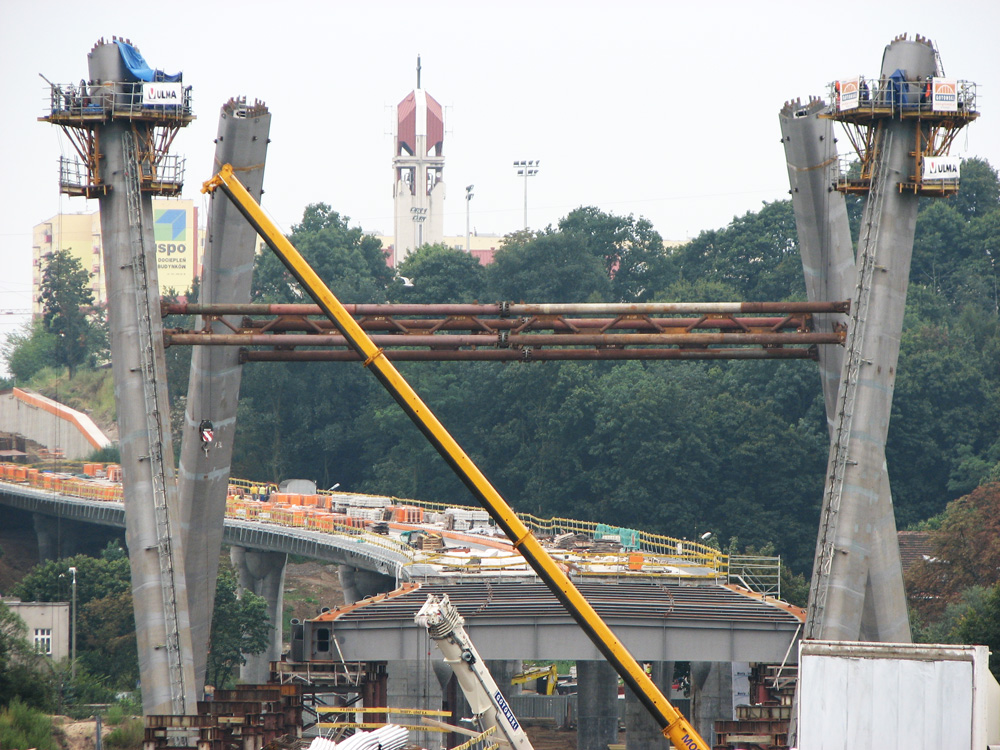 Jako pierwsza została zrealizowana estakada E3. Deskowanie płyty jezdnej obiektu, wykonane w systemie ENKOFORM H-120, zostało zaprojektowane ze specjalnymi wstawkami nadającymi oryginalny kształt spodu płyty (brak ostrych krawędzi). Konstrukcję podparto wieżami T-60; podczas montażu podparcia pod pierwszą i drugą sekcję na placu budowy było jednocześnie zmontowanych 250 wież. Wysokość najwyższej z nich przekraczała 10 m. Obecnie realizowane są: estakada E1 o długości ok. 270 m, wiadukty WD4 i WD5 o długości ok. 95 m każdy oraz stalowy pylon.
