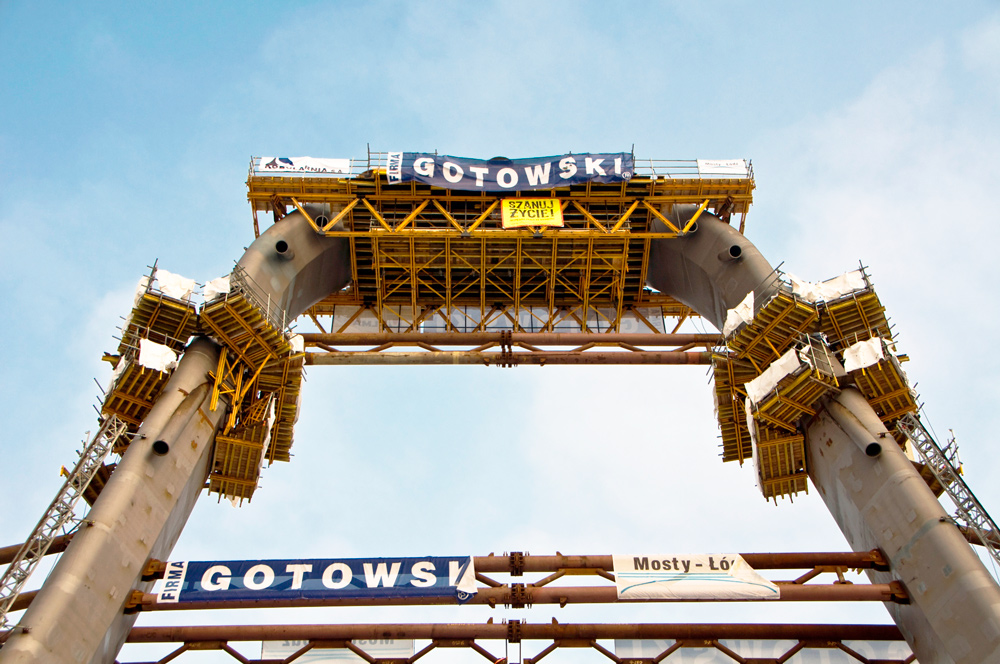 Najciekawszym elementem Trasy Uniwersyteckiej jest pylon mostu o wysokości 70 m, składający się z dwóch części w kształcie liter A i Ω. Jego konstrukcja wykonywana jest na miejscu z kolejnych segmentów, łączonych ze sobą przez spawanie. Każda noga na prostym odcinku składa się z od 25 do 28 segmentów o wysokości od 1,5 do 2,5 m. Ze względu na skomplikowaną geometrię obiektu – różne kąty nachylenia każdej płaszczyzny pylonu – ULMA zaproponowała rozwiązanie z zastosowaniem pomostów wznoszących BMK. Zaprojektowano po cztery pomosty na każdą nogę pylonu, składające się z dwóch podestów górnego i dolnego. Rozwiązanie to umożliwia jednoczesne wykonywanie z podestu górnego połączeń spawanych elementów, a z dolnego szlifowanie spoin i pokrywanie farbą antykorozyjną uprzednio wykonanych połączeń. Cykl scalania jednego segmentu na każdej nodze pylonu trwa ok. czterech dni.