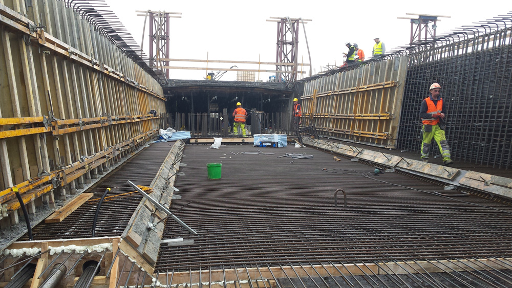 Poszczególne segmenty były betonowane w dwóch taktach. W pierwszym takcie wykonywano płytę denną oraz ściany przekroju skrzynkowego. Podłoga wytwórni została zaprojektowana na profilach stalowych ustawianych na siłownikach hydraulicznych, które umożliwiają odspojenie deskowania od wykonanej konstrukcji oraz służą do niwelacji wytwórni. Połączenie deskowania zewnętrznego z profilami podłogi gwarantuje jednoczesne rozszalowanie podłogi i ścian, przy opuszczaniu siłowników.