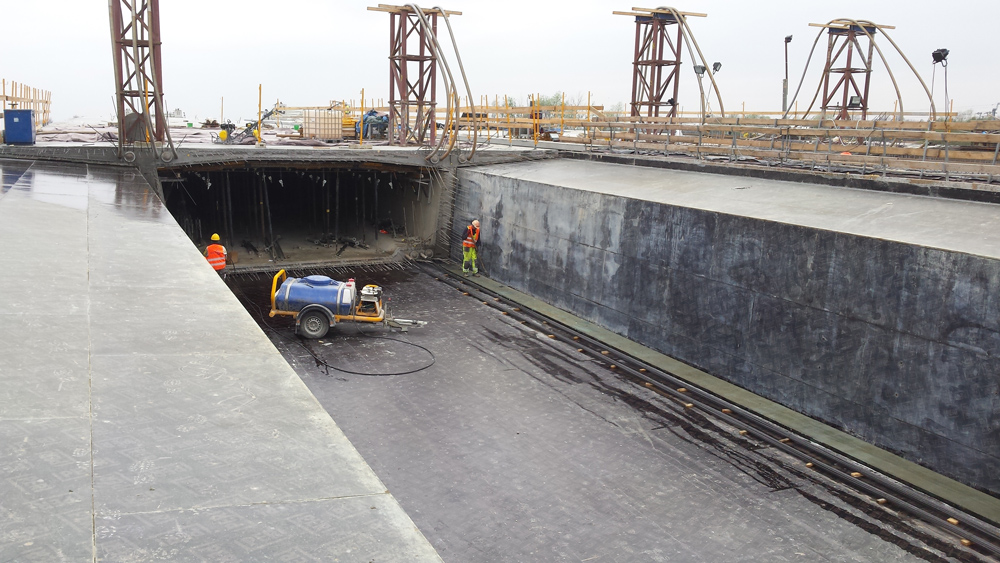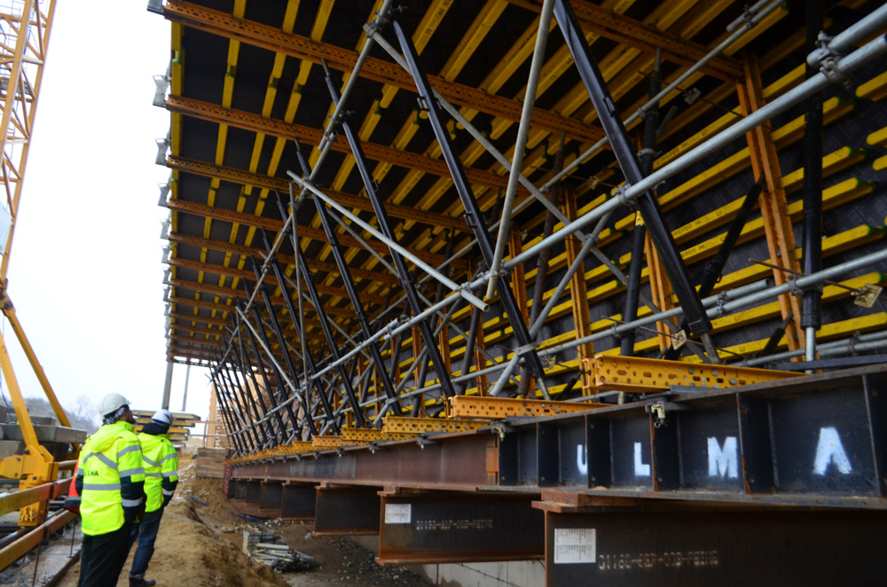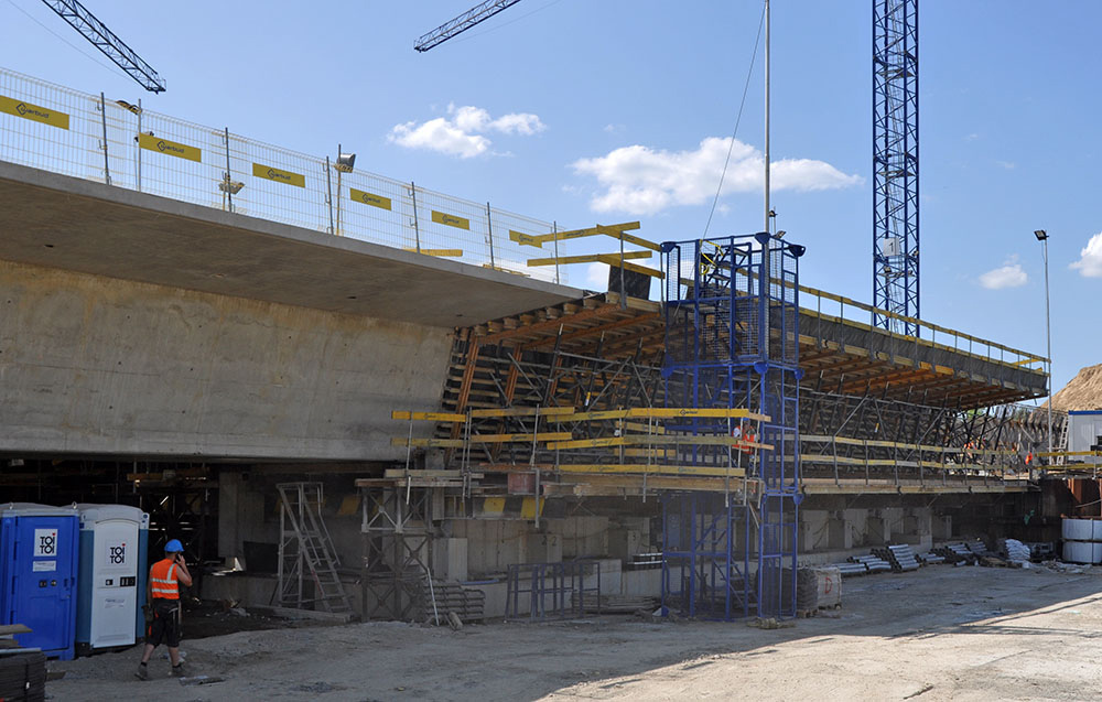 Ze względu na ograniczenia wymiarów wynikające z projektu wykonawczego, do realizacji płyty górnej zaprojektowano deskowanie przejezdne na wspornikach rolkowych, składające się z rozwiązania na bazie rygli MK-120, elementów deskowania ściennego COMAIN oraz podpór pionujących typu E. Wsporniki rolkowe służą tu jedynie do podparcia płyty górnej na czas przejazdu i nie spełniają już tej roli podczas betonowania. Zastosowane rozwiązanie umożliwia przemieszczenie deskowania płyty jezdnej jako kompletnego układu na następną sekcję.