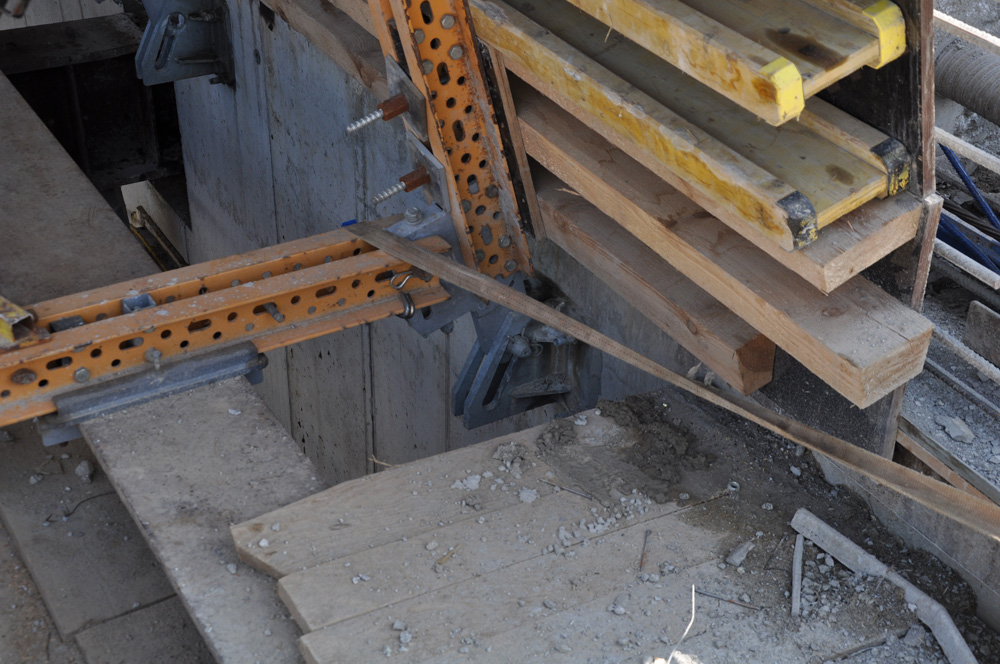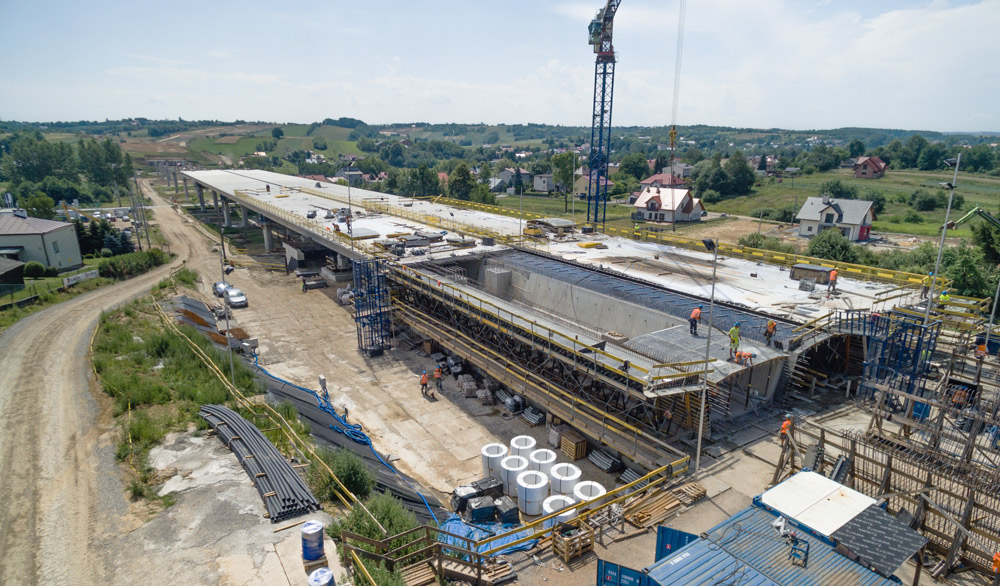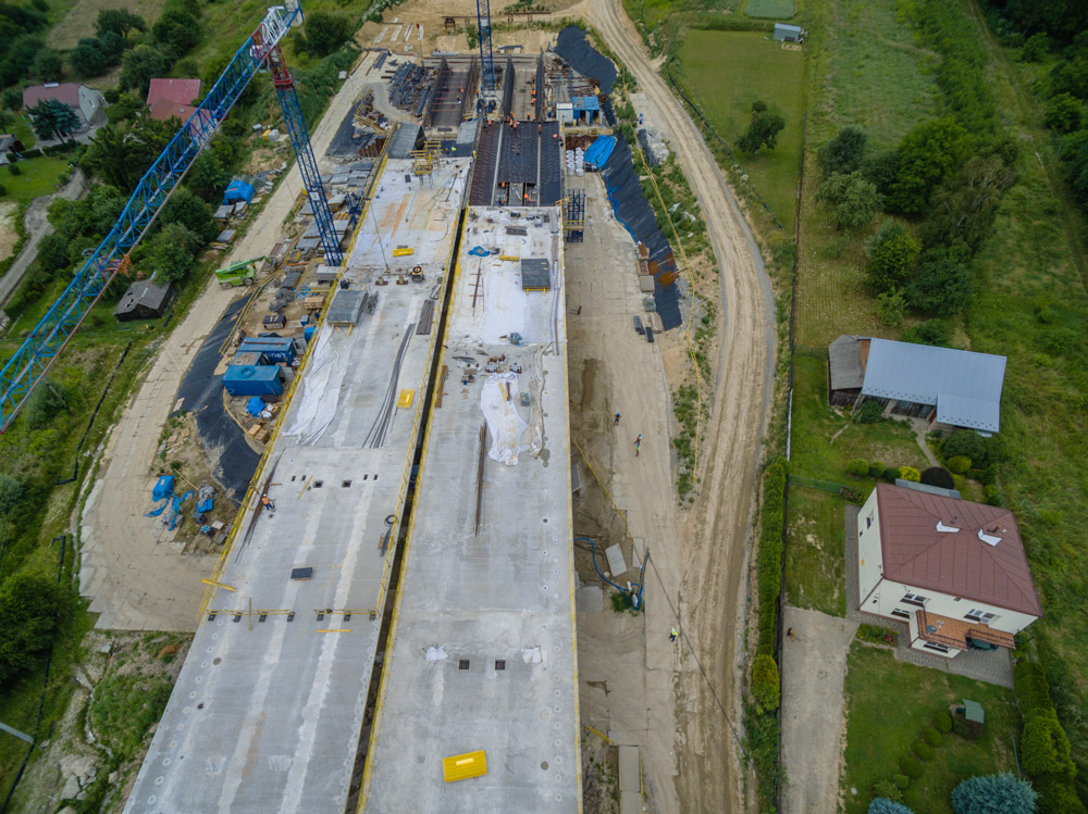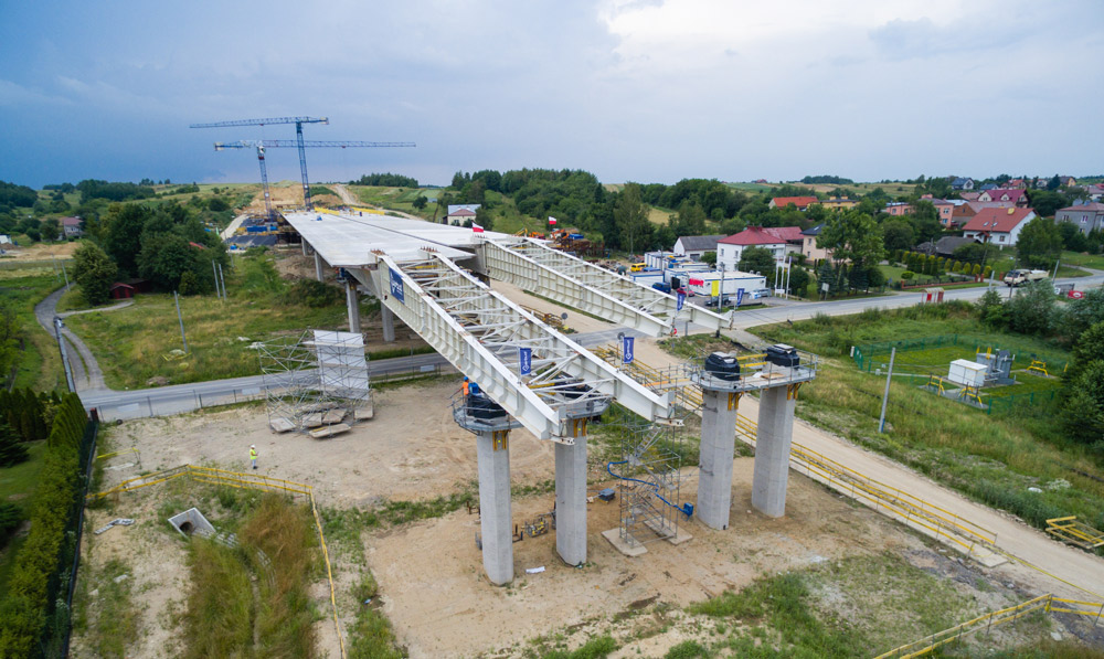 Podpory pośrednie o wysokości 12 m zrealizowano przy wykorzystaniu deskowania dźwigarkowego ENKOFORM VMK. Bezpieczną obsługe prac podczas ich wznoszenia oraz całego procesu nasuwania zagwarantowało zastosowanie pomostów uniwersalnych oraz schodni BRIO.