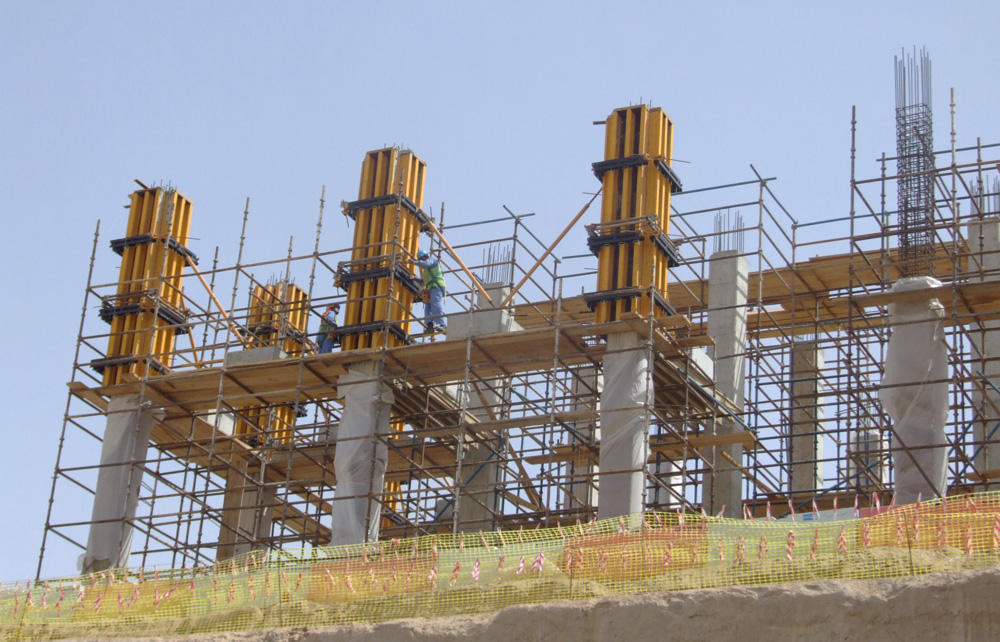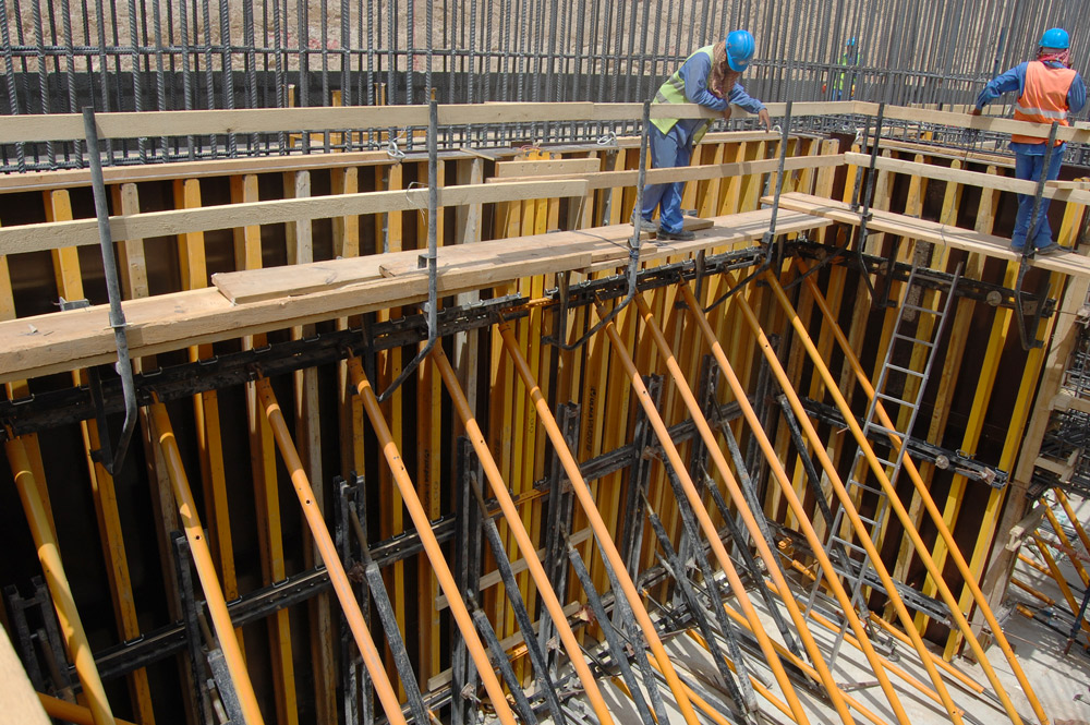 Ściany obiektu wykonano przy użyciu systemowego deskowania pionowego ENKOFORM VMK. Deskowanie jednostronne wypierano za pomocą kozłów oporowych UCAB.