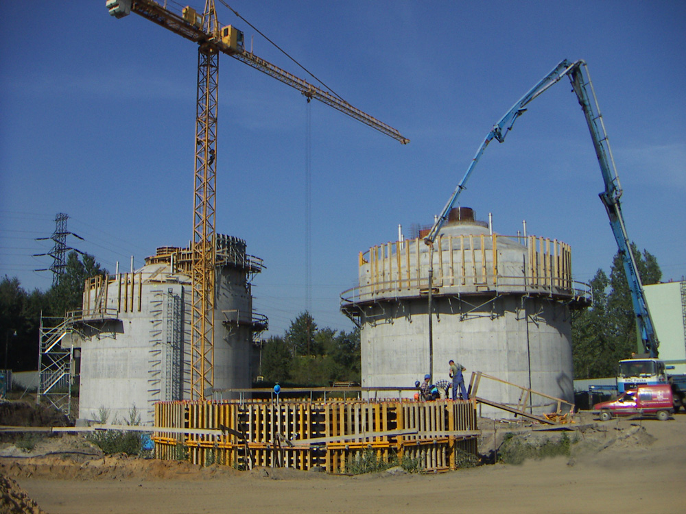 Wykonano 3 obiekty radialne o średnicy 20 m i wysokości ścian 4,5 m. Ze względu na wymóg uzyskania betonów architektonicznych zbiorniki zostały wykonane z zastosowaniem systemu dźwigarkowego, co pozwoliło na dostosowanie geometrii deskowania do specyficznych kształtów zbiorników. Osadniki wykonano wykorzystując potencjał 1/8 obwodu, w przełożeniach zgodnych z projektowanymi przerwami dylatacyjnymi. Uzyskano oczekiwaną idealną jakość betonów.
