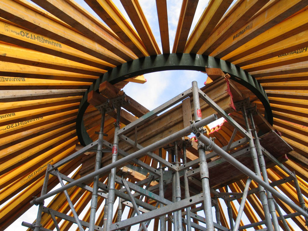 Konstrukcja poszycia kopuły stropu została posadowiona na pomoście pośrednim na wysokości 12 m od poziomu dna zbiornika, wykonanym z rygli i sklejki. Konstrukcję wsporczą pomostu stanowił układ 50 stężonych ze sobą wież o różnej wysokości.