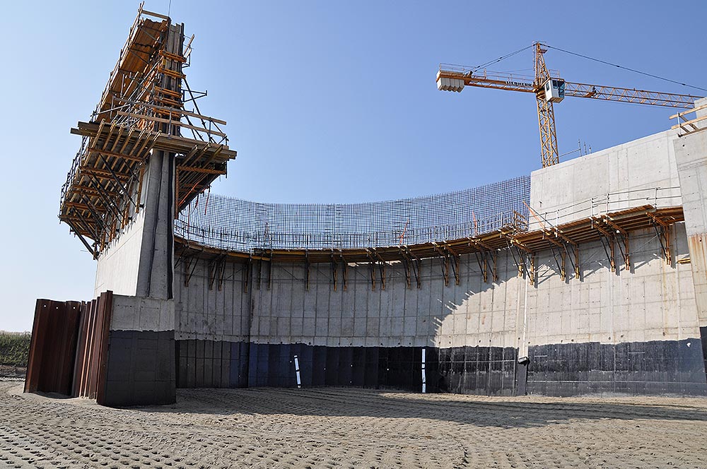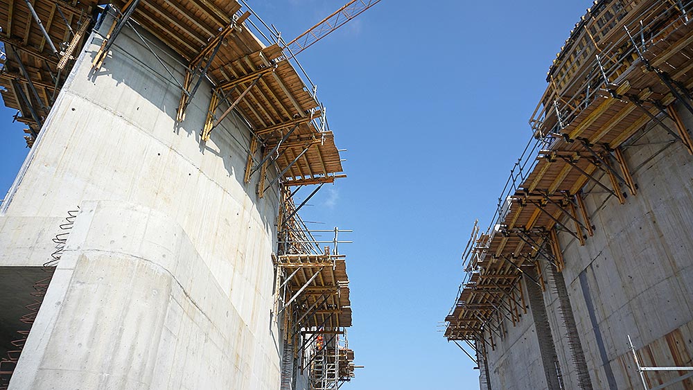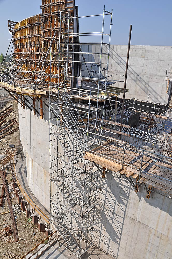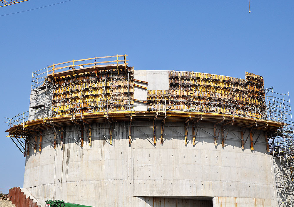 Firma ULMA dostarczyła kompleksowe rozwiązania do budowy m.in. budowli przelewowo - spustowej . Podczas realizacji ścian doskonale sprawdziło się deskowanie ścienne PRIMO oraz NEVI. Ściany zakrzywione w planie („dzioby” i tył filarów, mury oporowe przy przyczółku prawym i lewym) wzniesiono za pomocą deskowania radialnego BIRA. System BMK, stosowany był od momentu utracenia możliwości wypierania deskowania z poziomu terenu. Zastosowano konsole bez użycia pomostów demontażowych. Na podeście roboczym użyte zostały dodatkowe rygle stalowe, umożliwiające bezkolizyjne pionowanie deskowania z konsol BMK. Potencjał dostarczony na budowę umożliwiał zachowanie ciągłości prac na każdym z pięciu filarów, dwóch przyczółkach oraz murach oporowych. Komunikacja na dany poziom roboczy odbywała się za pomocą schodni rusztowaniowej BRIO.