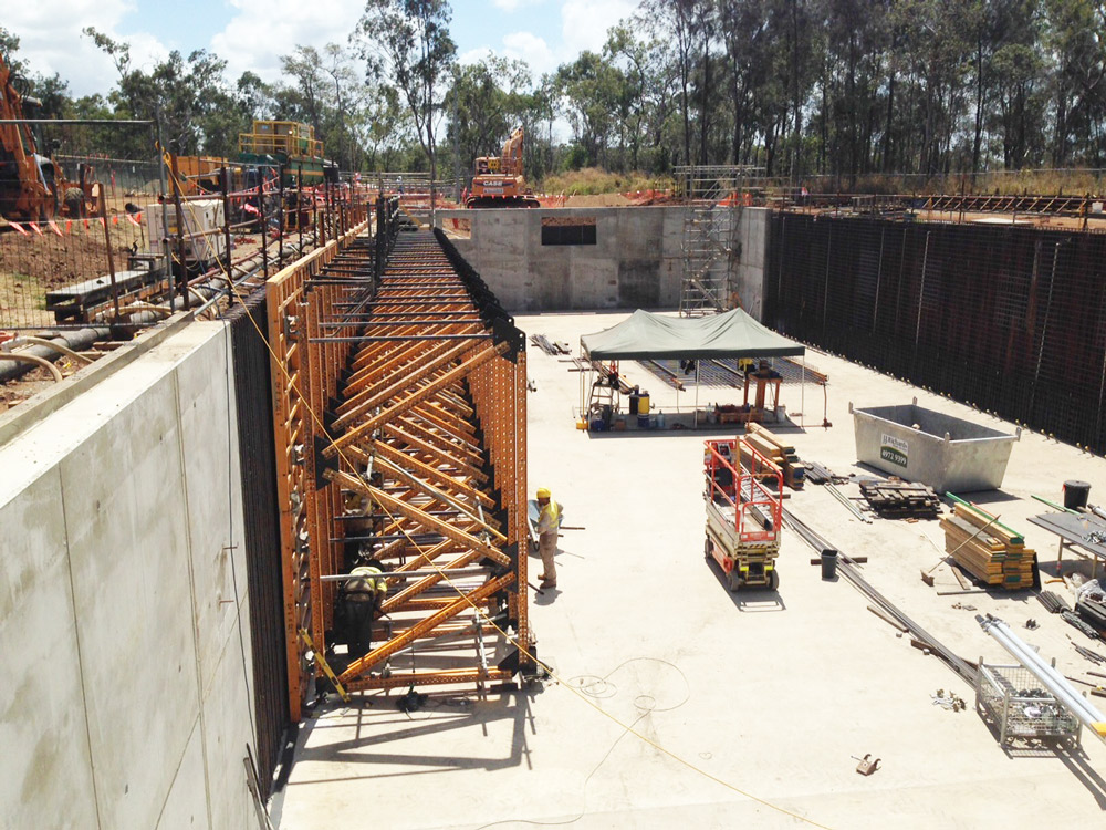 Rozwiązanie szalunkowe uwzględniało realizację prostokątnego zbiornika o wysokości 5,4 m w czterech taktach. Projekt deskowań uwzględniał zmienne obciążenia powstające podczas układania mieszanki betonowej, które przekazywane były na płytę fundamentową o grubości 300 mm wykonaną na palach.