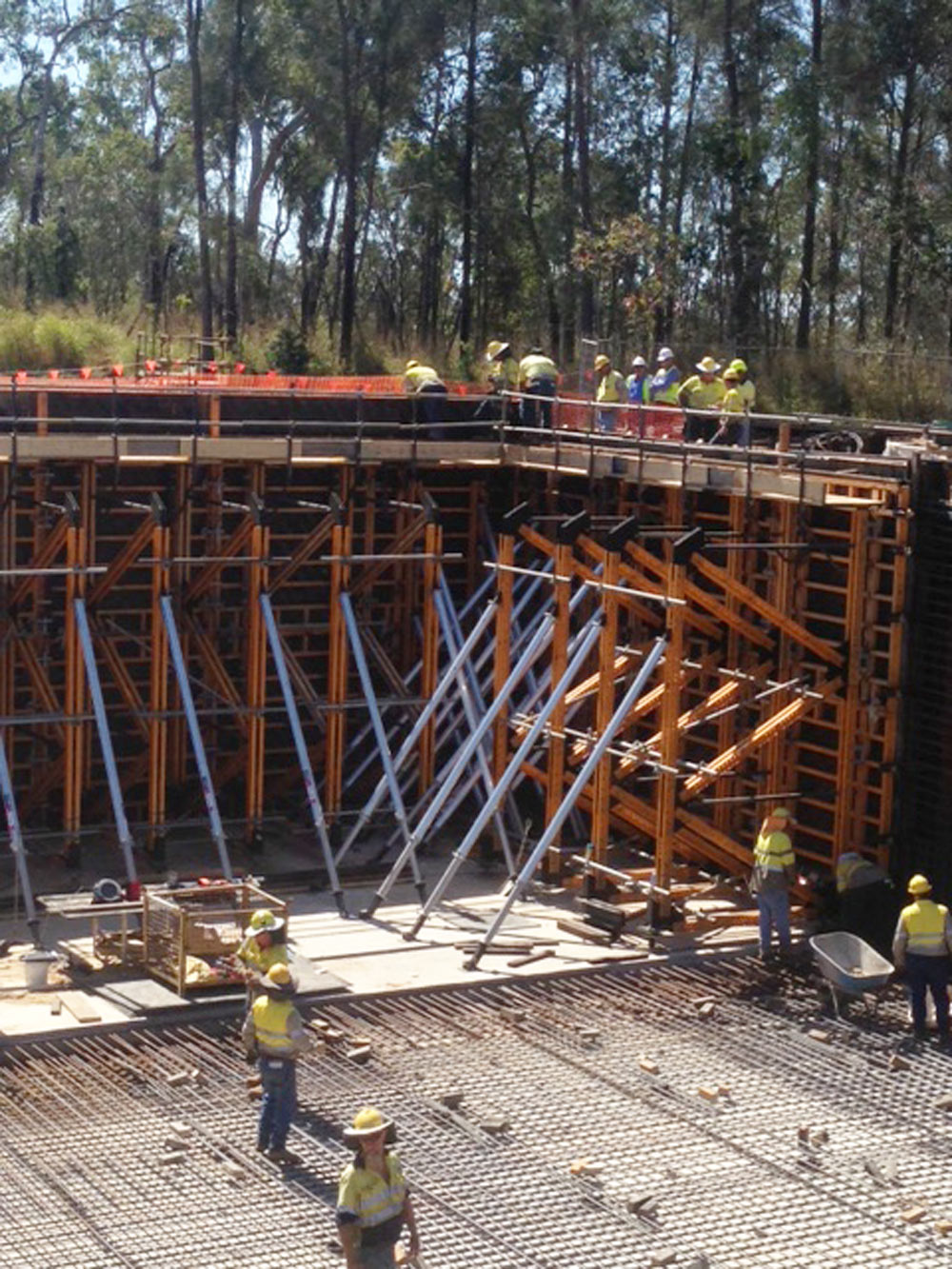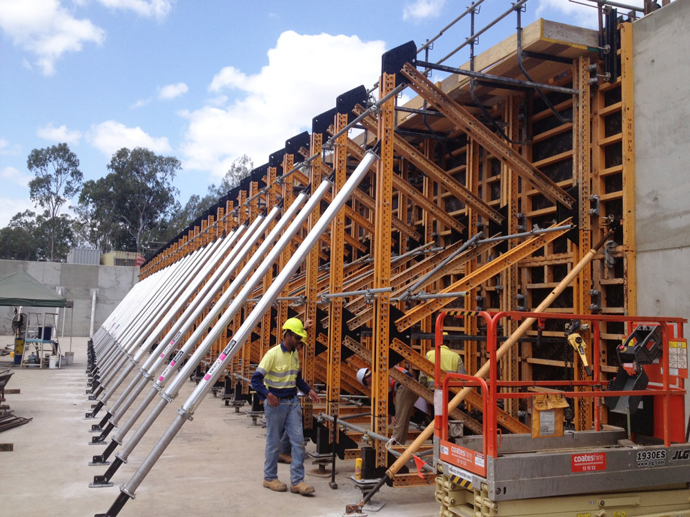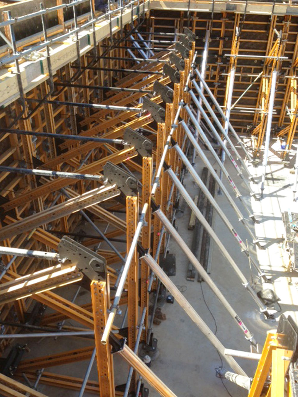 Odpowiednia dystrybucję obciążeń gwarantowało rozwiązanie bazujące na kozłach oporowych MK. Deskowanie ścienne ORMA o powierzchni 594 m2 i wysokości 5,40 m zostało wyparte przez kozły oporowe MK.